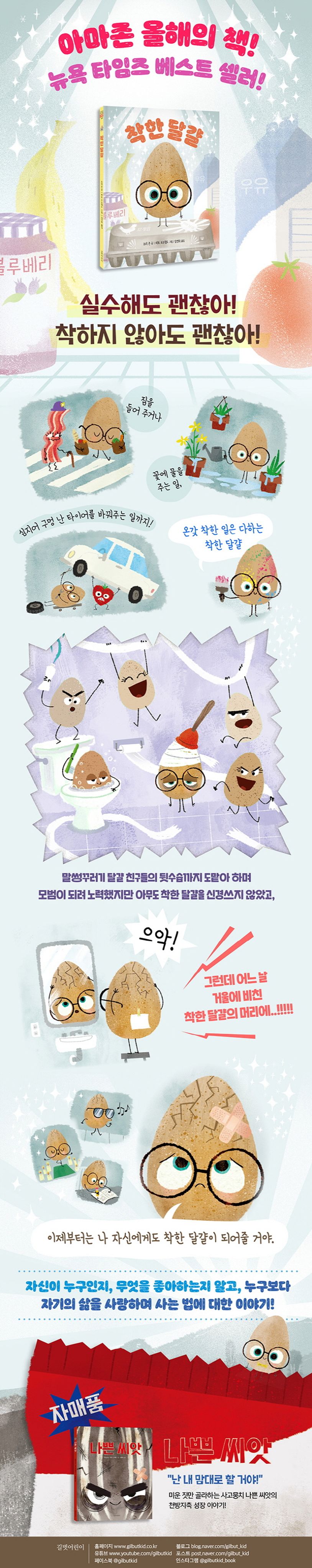 《착한 달걀》은 전작 《나쁜 씨앗》으로 뉴욕타임즈 베스트셀러 작가가 된 조리 존과 피트 오즈월드의 후속작입니다. 《착한 달걀》도 출간과 동시에 아마존 올해의 책, 뉴욕 타임즈 베스트셀러 자리를 꿰차며 여전한 인기를 증명했습니다. 장난기 가득한 얼굴에, 여기저기 긁힌 상처와 퉁퉁 붓고 멍든 눈까지. 반항기 가득한 말썽꾸러기인 나쁜 씨앗의 모습을 강렬하게 그려 내며 많은 독자들의 호응을 얻었던 작가들이 이번에는 똘망똘망한 눈, 아주 올바른 자세와 항상 친절한 미소를 잃지 않는 착한 달걀로 다시 찾아왔습니다. 항상 궂은일을 도맡아 하고 미소를 잃지 않으며 남을 도와주는 착한 달걀이 점점 지쳐가는 모습을 보고 있으면 누구라도 애잔한 마음이 들게 됩니다. 홀로 여행을 떠나 시간도 날짜도 알 수 없는 날들을 보내며 덥수룩하게 긴 수염과 오이 팩을 하며 피부 관리에 열심인 착한 달걀의 우스꽝스럽고 귀여운 모습에 폭소를 터뜨리다가도 한편으론 독자 스스로 자신이 진짜 원하는 게 무엇인지 자연스럽게 묻게 합니다.