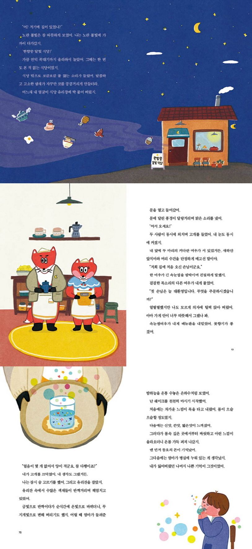 낮에는 보이지 않지만, 한밤중 달이 뜨면 노란 불빛을 반짝이며 나타나는 ‘한밤중 달빛 식당’은 살아가면서 누구나 받는 시련과 상처에 새 살을 돋게 해 준다. 어른과 아이가 함께 읽고 치유 받을 수 있는 ‘힐링 동화’다.