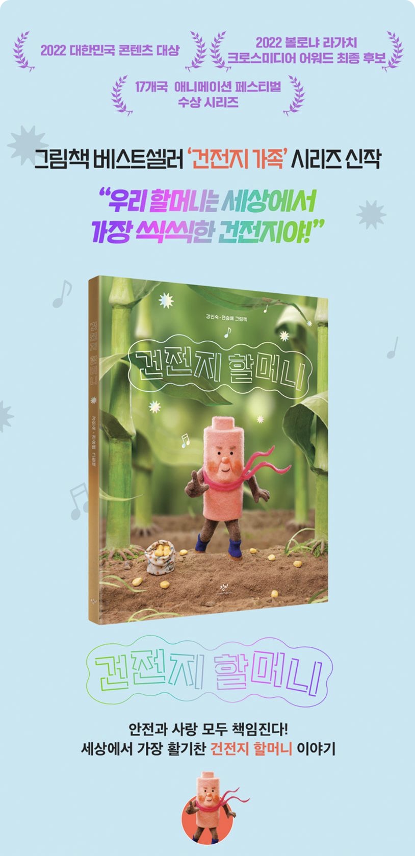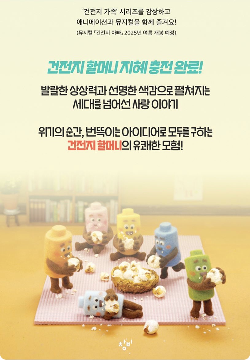 스톱 모션 애니메이션과 그림책 작업을 병행하며 인형들이 살아 움직이는 세계를 만드는 강인숙·전승배 작가의 신작 그림책 『건전지 할머니』가 출간되었다. 어린이 독자에게 든든한 가족의 의미를 전하는 ‘건전지 가족’ 시리즈 신작이다. 여름철 계곡에서 동구네 가족이 고립될 위기에 처하자 손전등 안에서 멋지게 구조 신호를 보내는 ‘건전지 아빠’, 겨울철 화재경보기 안으로 용감하게 뛰어들어 어린이집 아이들을 안전한 곳으로 대피시키는 ‘건전지 엄마’에 이어 할머니 이야기를 새롭게 선보인다.