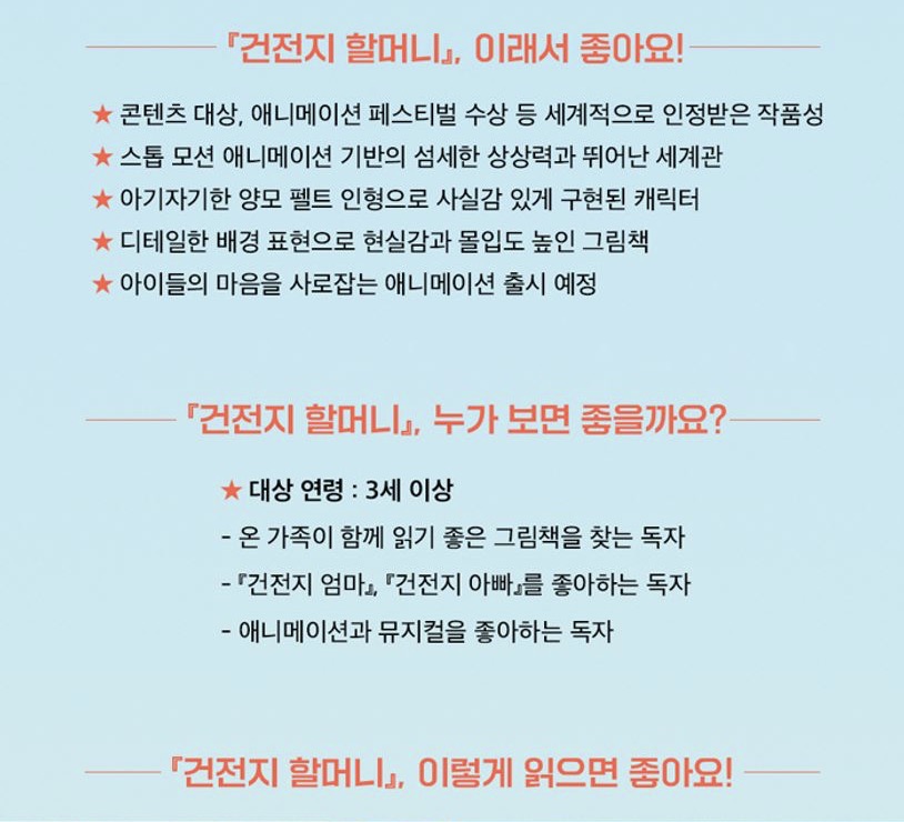 줄거리: 할머니는 우리 마음을 참 잘 알아요. 언제나 든든한, 우리 편이에요. 할머니는 세상에서 가장 씩씩한 건전지예요.