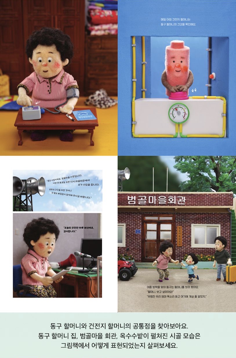 힘들었던 하루의 끝, 건전지 할머니는 장롱 아래 비밀 문을 연다. 그러자 할머니의 아늑한 집이 신비롭게 펼쳐진다. 이야기는 할머니를 찾아온 반가운 손님들을 보여 주며 막을 내린다. 바로 동구와 함께 할머니 집을 방문한 건전지 손주들이다. 건전지 할머니는 몰라보게 자란 손주들을 행복하게 바라보며 ‘충전 완료’를 외친다. 『건전지 할머니』는 양모 펠트 인형과 정성스러운 소품으로 알록달록하게 만든 화면을 통해 멀리 떨어져 있어도 서로를 생각하고 응원하는 마음이 얼마나 빛나는지 포근하게 전한다. 가족끼리 사랑하는 마음을 담아내어 읽을 때마다 마음이 환해지는 그림책이다. 온 세대, 온 가족의 마음에 다정한 빛을 켜는 이야기를 선물한다.