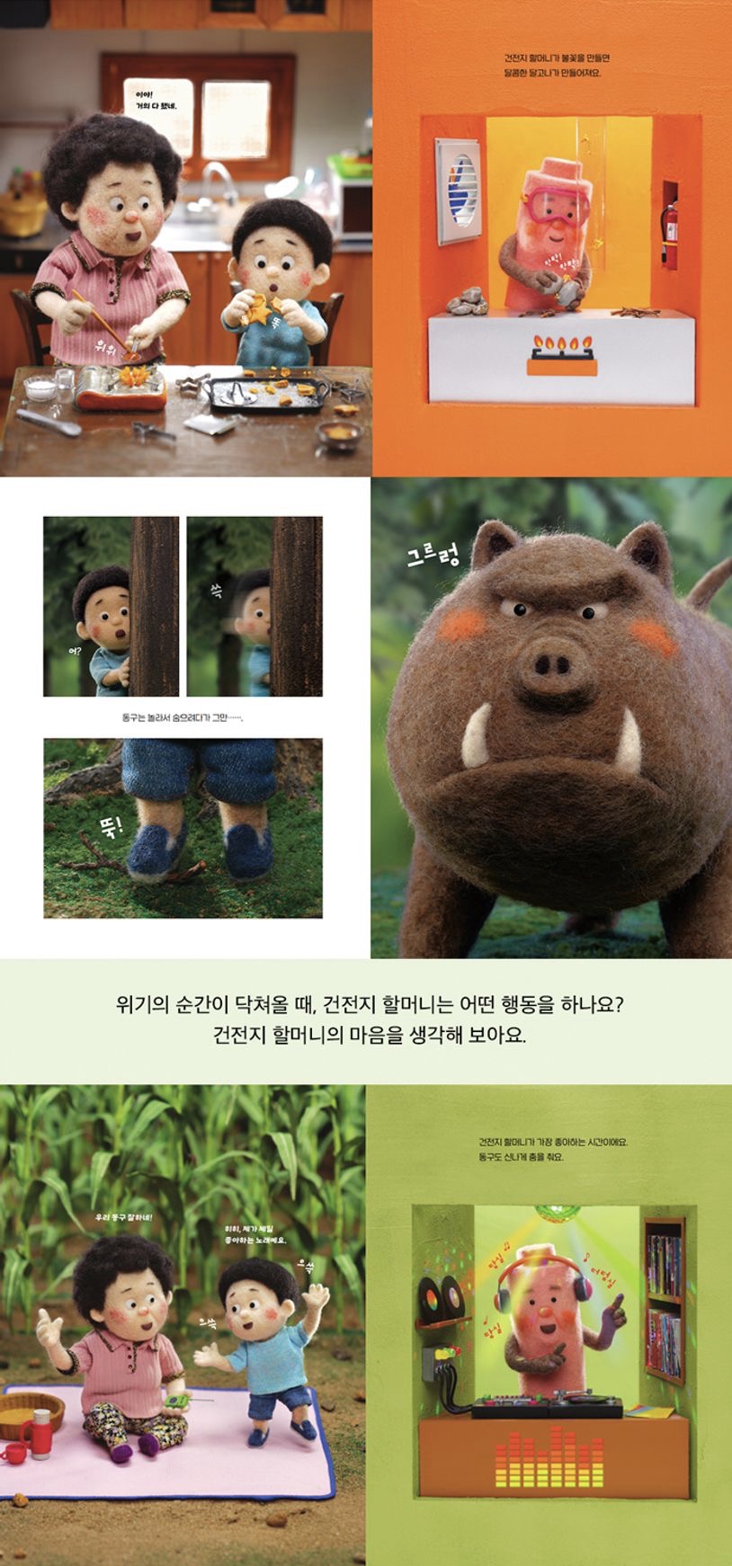 손주를 잃어버린 급박한 상황에서 민첩하게 대처하는 동구 할머니와 건전지 할머니의 모습이 교차로 편집되어 손에 땀을 쥐게 한다. 커다란 멧돼지와 마주한 위기의 순간, 할머니의 기지와 용기 덕분에 멧돼지 가족도, 동구 가족도 안전하게 집으로 돌아가는 결말이 안심을 준다. 작가들은 전기 울타리처럼 동물을 다치게 하는 방법이 아니라 소리를 통해 멧돼지가 인가에 접근하지 못하도록 한 경기도 한 마을의 실제 사례에서 영감을 받았다. 흥미진진한 이야기 속에 자칫 무겁게 느껴질 수 있는 인간과 야생 동물의 공존 문제를 풀어내었다.