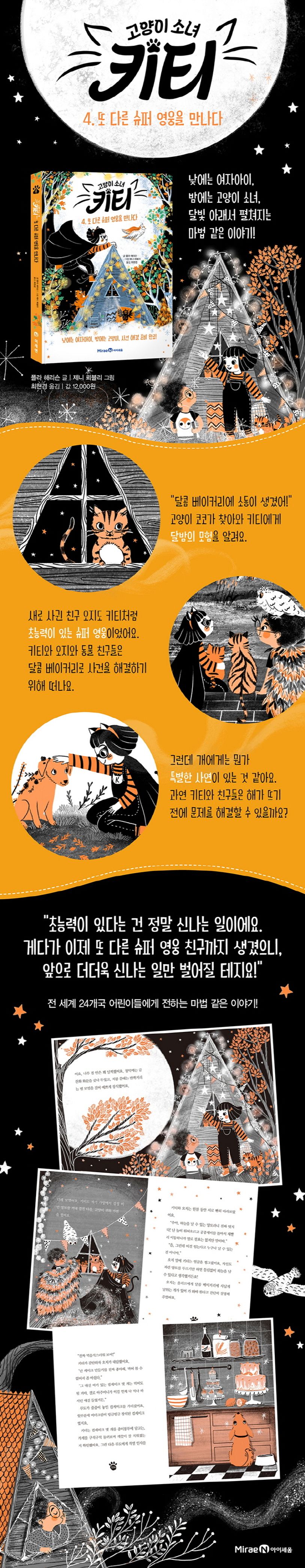 4편에서는 새로운 동물 친구들과 슈퍼 영웅이 등장합니다. 겁이 많아 보이지만 든든한 키티의 단짝친구 호두, 문제가 생기면 가장 먼저 키티에게 알리는 코코, 달콤 베이커리에 살고 있는 골든 래브라도 개 루도! 게다가 키티처럼 특별한 초능력이 있는 남자아이 오지도 빠질 수 없습니다. 고양이나 강아지, 슈퍼 영웅을 좋아하는 아이들이라면 흥미진진한 모험 서사에 푹 빠져들 것입니다.