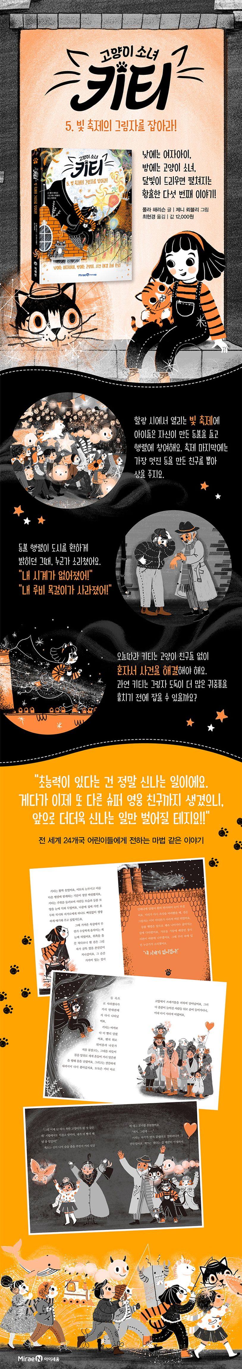 5편에서는 빛 축제 등불 행렬이 열리는 할람 시를 보여줍니다. 또한 아이들이 만든 다양한 모양의 등불도 독자들의 시선을 사로잡지요. 키티만큼이나 날쌔고 재빠른 그림자 도둑의 정체도 흥미진진함 모험 서사에 푹 빠져들게 할 거예요.