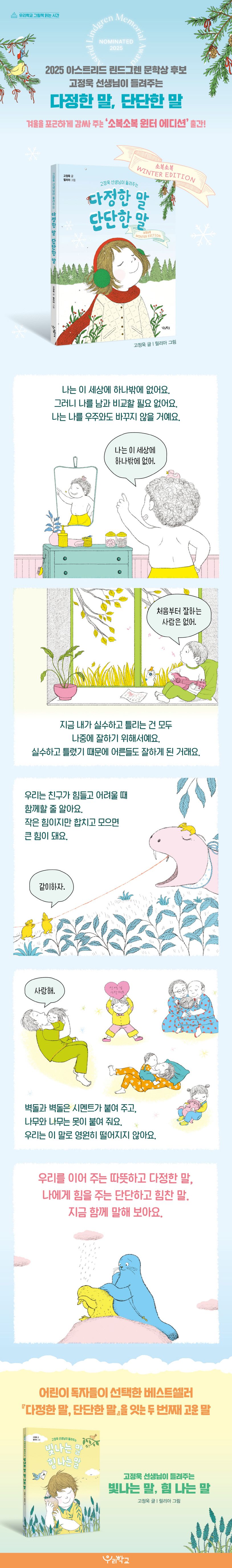『고정욱 선생님이 들려주는 다정한 말, 단단한 말』은 수많은 어린이를 만나며 활발히 소통해 온 고정욱 작가의 이야기에, 『파랑 오리』로 전 세계 그림책 독자들에게 감동을 불러일으킨 릴리아 작가가 그림을 그린 작품이다. 고정욱 작가의 나긋한 목소리가 담긴 듯한 글에 어우러진 그림들은 페이지마다 쉼표 같은 여백과 여운을 남긴다. 각각의 페이지에 담긴 말과 공감을 주는 고정욱 작가의 진정성 있는 이야기 한마디에 더해진 릴리아 작가의 그림은 독자들의 마음속에 차분하고 고요한 물결을 퍼뜨린다. 릴리아 작가만이 지닌 섬세한 감수성은, 지금까지 서투른 마음으로 인해 누군가에게 상처받았거나 나 자신과 소중한 사람들을 다독이고 싶은 독자들의 마음을 어루만져 주며 다시 한번 책을 펼치고 싶은 여운을 남긴다. 이 책은 나와 누군가를 포근하게 안아 주고 싶은 이들에게 언어를 통해, 그리고 글과 그림을 통해 어떤 것보다도 단단하고, 누구보다도 다정한 마음을 가지게 해 줄 것이다.
