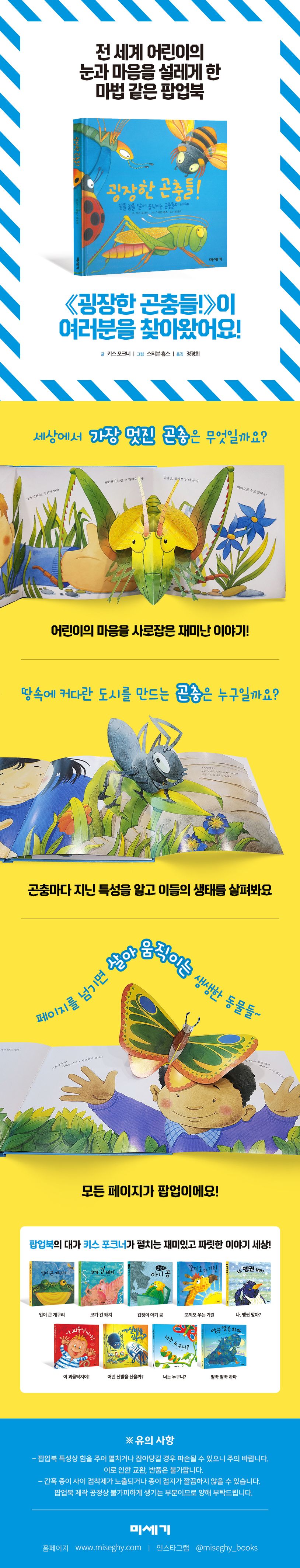인간은 자연의 일부이다. 따라서 어려서부터 인간과 자연의 관계, 자연의 신비를 깊이 있게 이해한 아이가 원만한 인간성과 인생에 대한 넓은 시야를 가진다는 것은 너무나 당연하다. 어린이들은 곤충을 즐겨 관찰하며 곤충을 가지고 놀기도 잘 한다. 작은 곤충 한 마리가 아이들에게는 신비한 자연, 우리가 속한 세계의 모습을 보여주고 자연과 인간의 관계를 이해시키는 작은 교과서가 될 수 있는 것이다. 수준 있는 그림과 아이들의 눈을 사로잡는 입체, 유익하고 재미있는 내용으로 이루어진 입체 그림책 굉장한 곤충들! 을 통해 아이들이 원만하고 조화로운 사람으로 성장하길 기대해 본다.