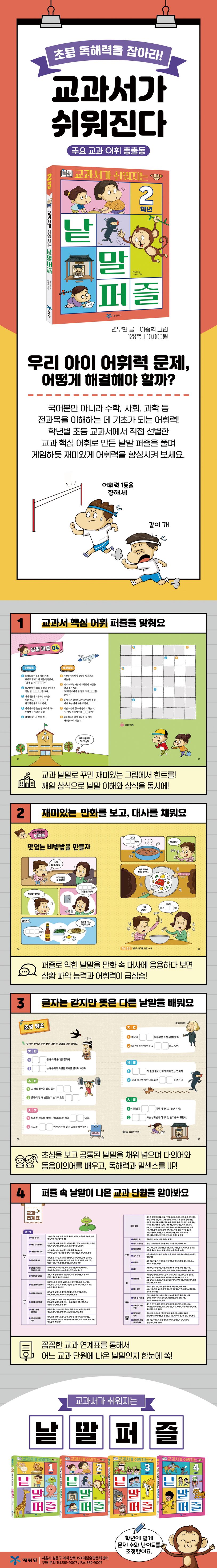책을 읽기보다는 온라인의 짧고 간결한 단어로 소통하는 것이 익숙한 탓일까요? 오늘날 아이들의 어휘력이 부족해 교과서조차 읽기 힘들어한다는 기사가 심심치 않게 보입니다. 심지어 코로나19로 인해 집에 혼자 있는 시간이 길어지며 소통이 줄어들고, 자연히 아이들의 어휘력까지 위협받고 있지요. 학습에서 어휘력은 무엇보다 중요합니다. 국어 교과뿐만 아니라, 수학이나 사회, 과학 같은 다른 과목에서도 학습 내용을 이해하는 기초가 되지요. 〈교과서가 쉬워지는 낱말 퍼즐〉은 낱말 퍼즐 형식을 통해 아이들이 쉽고 재미있게 퍼즐을 풀면서 자연스럽게 어휘력을 향상시킬 수 있는 책입니다. 아이와 부담 없이 게임을 하듯 낱말 퍼즐을 풀고 만화를 읽으며 모든 과목의 기본이 되는 어휘력을 높여 보세요.