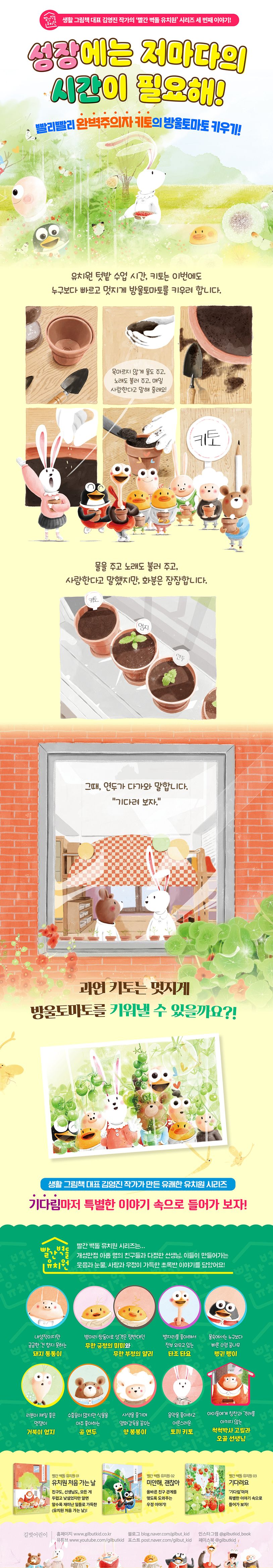 키토는 초록반에서 뭐든 빠르게 잘 하는 영리한 아이입니다. 발표할 때도 자신감이 넘치지요. 그런데 늘 친구들보다 앞서던 키토에게 곤란한 일이 생겼습니다. 방울토마토를 키우는 텃밭 수업 시간, 다른 화분은 무럭무럭 자라는데 키토의 방울토마토는 겨우 작은 싹만 올라왔거든요. 며칠째 방울토마토 앞에서 한숨만 쉬는 키토. 그때 연두가 키토에게 식물 보약을 건네며 ‘기다려 보자’고 말합니다.