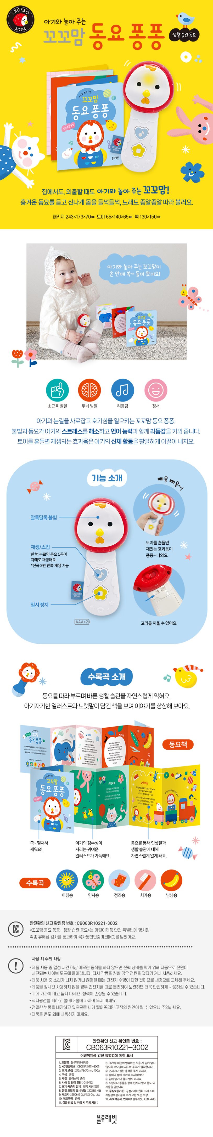 아기는 손을 사용할수록 두뇌가 발달해요. 꼬꼬맘 동요 퐁퐁은 아기 손에 꼭 맞는 크기의 손잡이, 가벼운 무게, 큼직한 버튼이 아기의 손놀림 활동이 활발하게끔 이끌어 줍니다. 귀여운 꼬꼬맘의 두 눈을 응시하며 눈맞춤도 해 보아요. 알록달록 은은하게 반짝이는 불빛도 아기의 눈길을 사로잡습니다. 모두 아기가 마음껏 호기심을 발휘하고 즐거운 경험이 되도록 섬세하게 설계하였어요.
