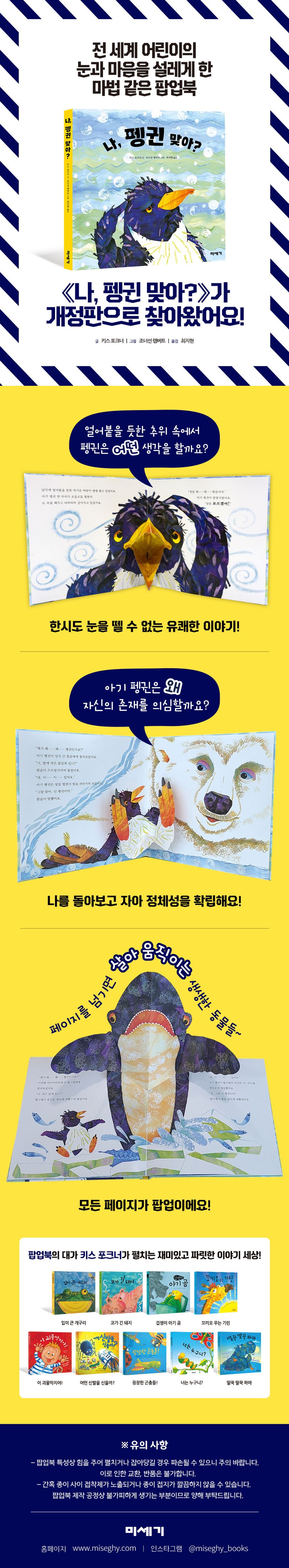 《나, 펭귄 맞아?》에는 다양한 바다 동물들이 등장합니다. 아기 펭귄과 엄마 펭귄, 덩치가 크고 하얀 털을 가진 흰곰, 짧고 빳빳한 털을 가진 바다코끼리, 무시무시한 이빨을 가진 범고래가 그 주인공들이죠. 이 책은 그 동물들의 생김새를 세밀한 그림으로 섬세하게 묘사합니다. 펭귄의 물갈퀴, 뾰족하고 작은 부리 그리고 귀여운 날개까지 직접 확인해 보세요! 또한 팝업은 동물 특징을 더 극적으로 보여줍니다. 어린이들은 팝업을 즐기면서 바다코끼리의 엄니가 얼마나 길쭉한지, 바다 위를 솟아오르는 범고래의 지느러미가 얼마나 큰지, 엄마 펭귄의 부리는 아기 펭귄의 것보다 얼마나 더 튀어나와 있는지를 알 수 있어요! 책이 펼쳐질 때마다 살아 움직이는 바다 동물들을 만나 보세요. 책장을 넘길 때마다 펼쳐지는 새로운 팝업을 기대하는 재미도 가득하답니다.