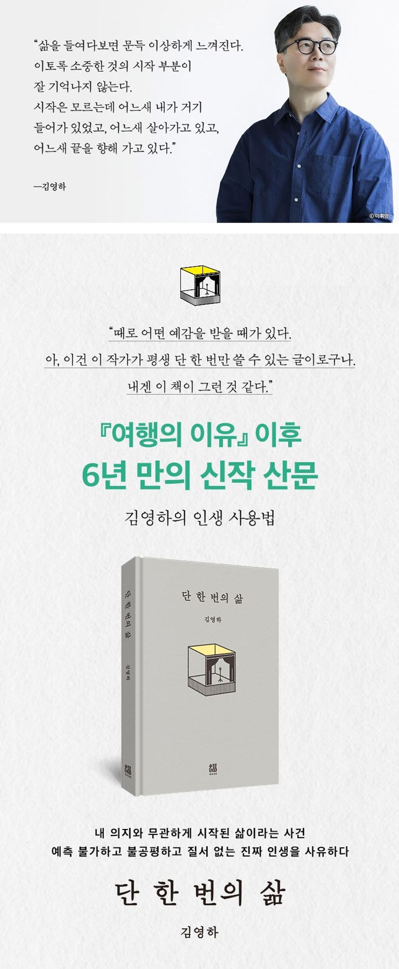 이야기는 자연스레 독자의 삶으로 이어진다. 김영하가 자신의 기억을 정리하며 지나온 시간을 되돌아본 것처럼, 독자도 이 책을 읽으며 자신만의 ‘단 한 번의 삶’을 되새기게 된다. 그는 살아가면서 마주한 관계나 사회에서 요구하는 역할 속에서 자신이 어떤 선택을 해왔는지 차분히 회고한다. 그러나 이 회고는 단순한 과거 회상이 아니라, 저마다가 품고 있는 질문을 떠올리게 한다. 우리는 어떤 순간에 기대하고, 실망하고, 다시 길을 찾는가. 우리는 왜 어떤 선택을 했고, 하지 못했으며, 그것이 지금의 나에게 어떤 영향을 미쳤을까.