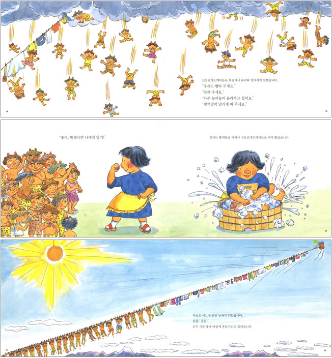 빨래하기를 너무나도 좋아하는 엄마. 날씨가 좋지 않지만 엄마는 빨래를 합니다. 빨래가 잘 마르지 않을 것 같자 엄마는 좋은 방법을 생각해냈지요. 집에 있는 커다란 연을 날린 후, 연 줄에 빨래를 널어 구름 위로 올렸습니다. 그러자 구름 위에 있던 천둥번개도깨비들은 깜짝놀랬고, 자신들도 연 줄에 널린 빨래들처럼 해보고 싶은 생각이 들었지요. 도깨비들은 아래로 내려와 엄마에게 부탁했고, 엄마는 또 도깨비들을 빨기시작했습니다. 한 명 한 명씩 연줄에 매달리는 도깨비들. 하지만 너무 바짝 말라서 뻣뻣해졌답니다.