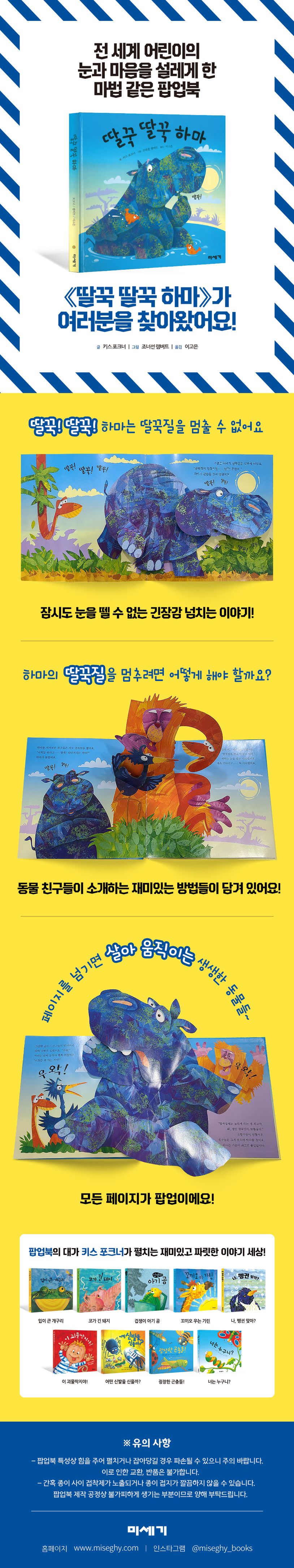 불쌍한 하마, 딸꾹질이 아주 심해요! 친구들은 저마다 딸꾹질 멈추는 법을 알려 줬어요. 하지만 모두 효과가 없었어요. 하마의 딸꾹질은 점점 더 심해졌어요. 친구들은 하마를 위해 머리를 맞대고 생각했어요. 그리고 딸꾹질을 멈출 방법을 찾을 수 있었지요. 누구든 한번 경험하면 잊을 수 없는 방법이랍니다. 책장을 넘기면 동물들이 고개를 움직이는 모습이 팝업으로 활짝 펼쳐져요. 여러 동물들 팝업과 함께 딸꾹질을 멈추는 재미있는 방법들이 나오는 팝업북이에요.