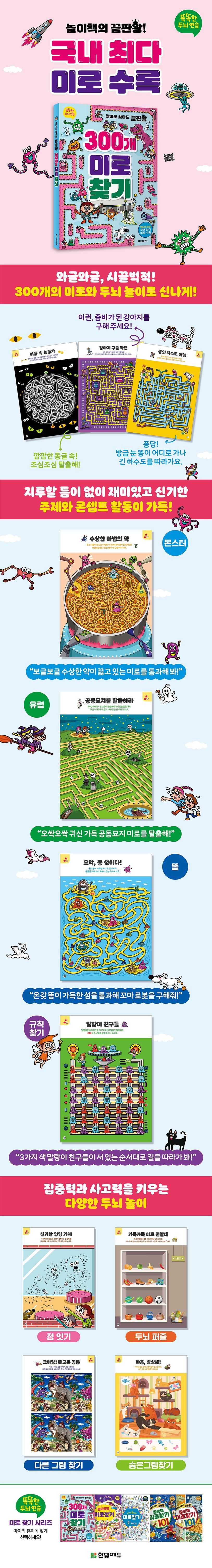 눈이 핑글핑글 돌아가는 복잡한 미로부터, 완전 쉬운 미로까지! 300개라는 어마어마한 개수로 한 권으로도 오래오래 놀 수 있어요. 단순한 길찾기가 아니에요. 끝말잇기 미로, 숫자 미로, 규칙 찾기 미로나 미션이 있는 미로 등 페이지를 넘길 때마다 색다른 미로가 펼쳐져요. 작은 미로가 두 개 있는 페이지는 친구와 함께 각각 길을 찾아가 보세요. 재미도 두 배랍니다.