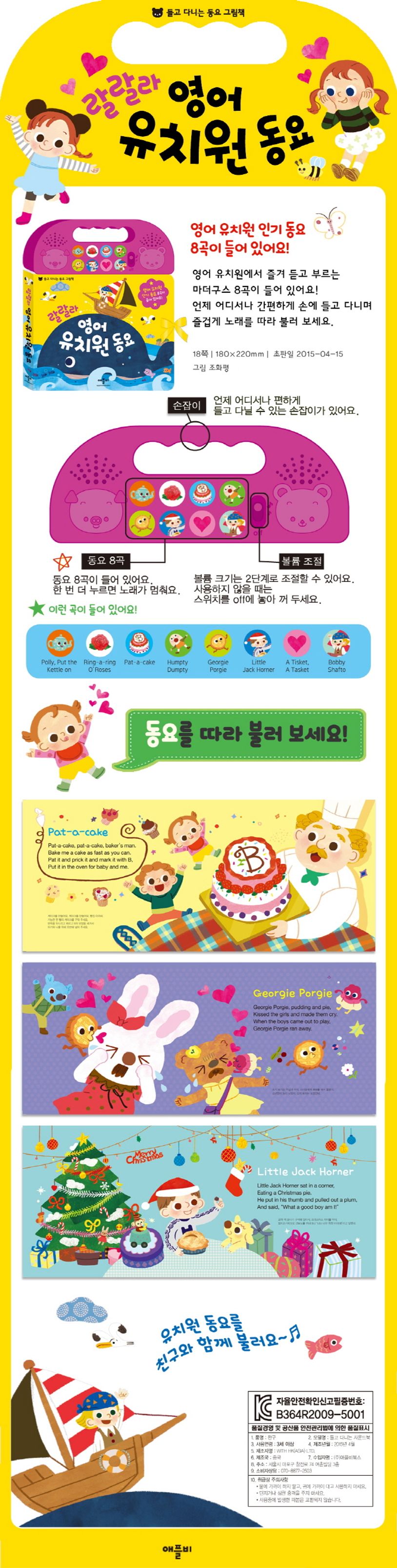 아이들이 들고 다니기 편하게 가방 모양으로 생긴 사운드북 『랄랄라 영어 유치원 동요』. 아이 손에 안성맞춤인 손잡이를 들고 다니며 언제 어디서나 신나게 동요를 듣고 따라 부를 수 있습니다. 총 8곡의 유아 대표 동요가 들어 있으며, 2단계로 볼륨 조절이 가능합니다. 아이들이 쉽게 영어를 배울 수 있도록 영어 가사와 노래의 느낌을 담은 멋진 그림을 실었습니다. 마더구스를 신나게 따라 부르며 영어 공부를 시작해 보세요.