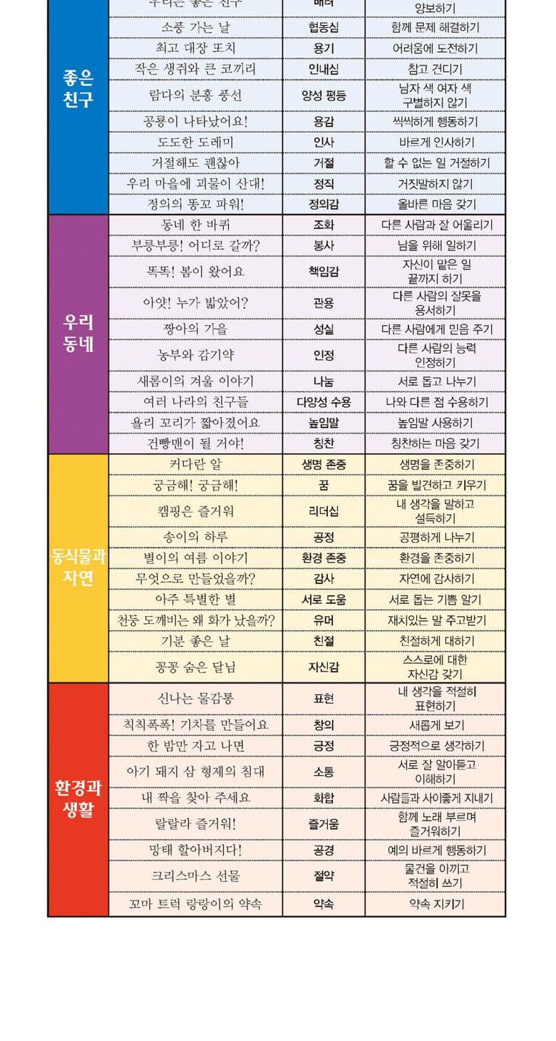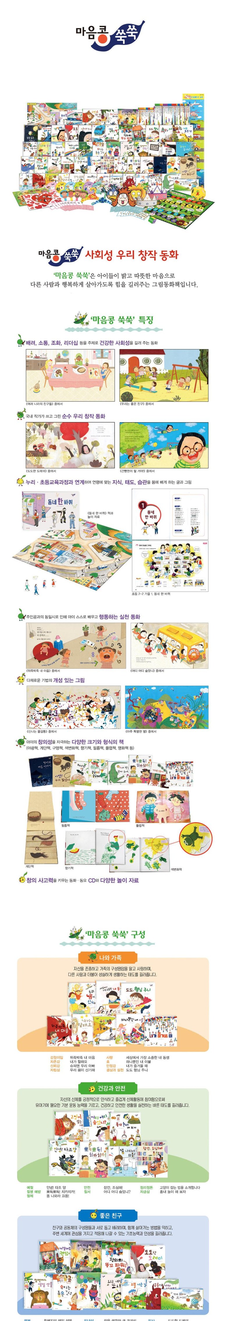 구성: 총 86종(본책 55권, 보물상자 – 붙임 딱지&컬러링북 1권, 놀이자료 21종, 구연 동화CD 6장, 동요 CD 2장, 동요 가사집)