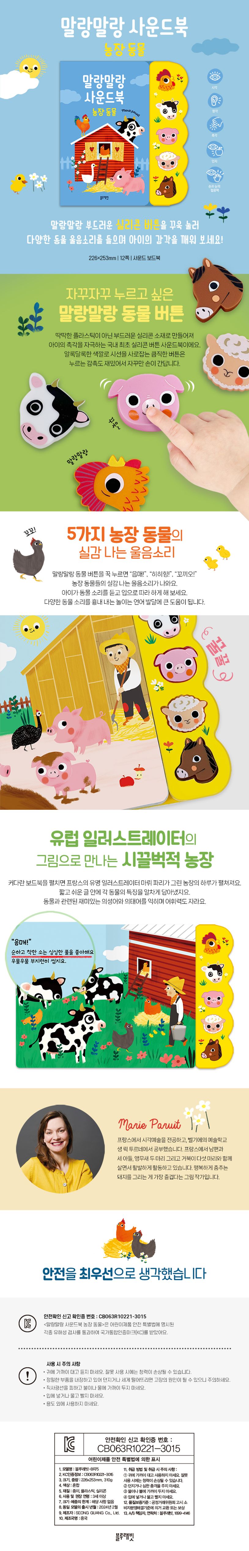 커다란 보드북을 펼치면 프랑스 유명 일러스트레이터 마뤼 파리가 그린 농장의 하루가 펼쳐져요. 짧고 쉬운 문장으로 표현된 글에는 각 동물의 특징과 습성까지 알차게 담아냈지요. 동물과 관련된 재미있는 의성어와 의태어를 익히며 어휘력도 쑥쑥 자라요.*안전을 최우선으로 생각했습니다