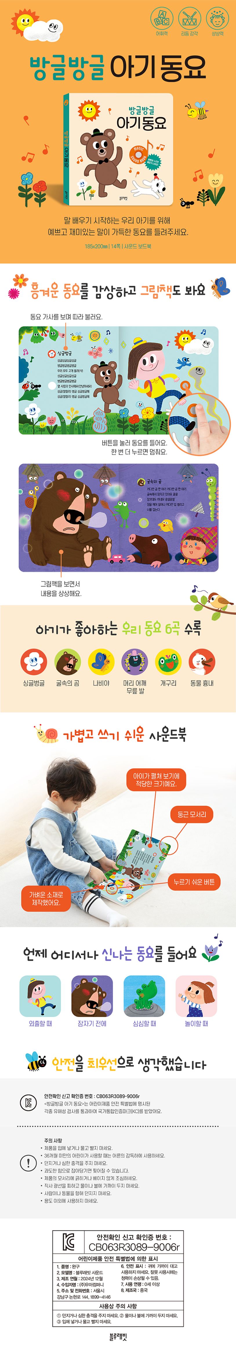사운드북의 무게가 가벼워서 아기가 쉽게 들 수 있어요. 동그라미 버튼을 가볍게 한 번 누르면 동요를 감상할 수 있지요. 버튼을 한 번 더 누르면 동요가 멈춰요.