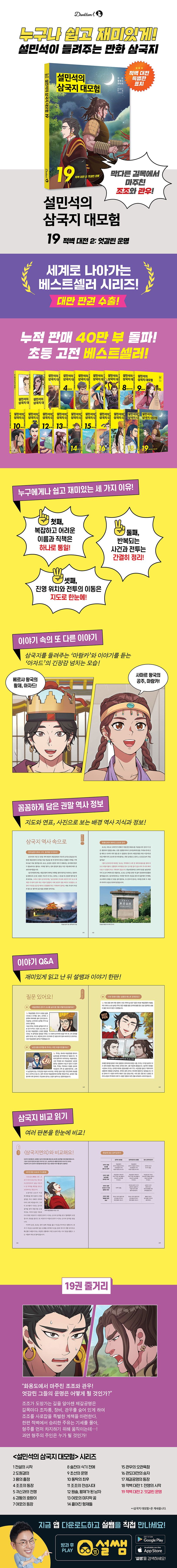 대만 판권 수출! 세계로 나아가는 베스트셀러 시리즈!삼국지는 약 1,800년 전 중국 삼국 시대의 역사를 바탕으로 창작된 이야기입니다. 혼란한 세상 속에서 꿈을 펼치며 나아간 영웅들의 용기와 지혜가 담겨 있어 오랜 시간 동안 사랑받고 있지요. 〈설민석의 삼국지 대모험〉은 그런 삼국지를 처음 접하는 어린이들도 재미있게 읽을 수 있도록 새롭게 엮은 책입니다.