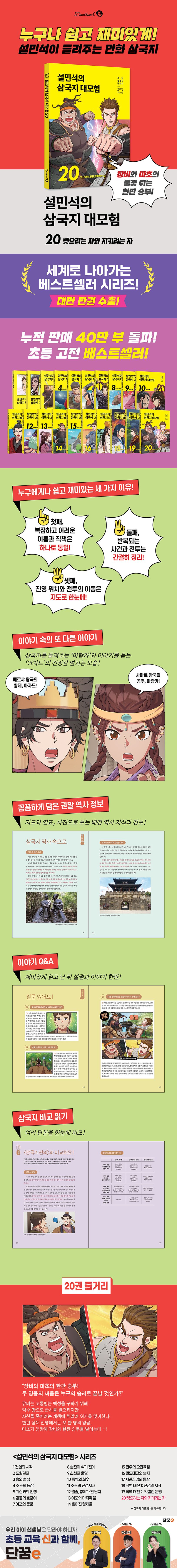 〈설민석의 삼국지 대모험〉 20권에서는 새로운 땅, 익주로 향하는 유비의 이야기가 펼쳐집니다. 또한 새로운 영웅 마초의 등장으로 흥미진진한 삼국지 이야기가 담겨 있지요. 〈설민석의 삼국지 대모험〉 속 수많은 영웅들의 이야기를 통해 오늘날을 살아가는 용기와 지혜를 얻길 바랍니다.1. 누구나 쉽고 재미있게! 처음 만나는 삼국지
