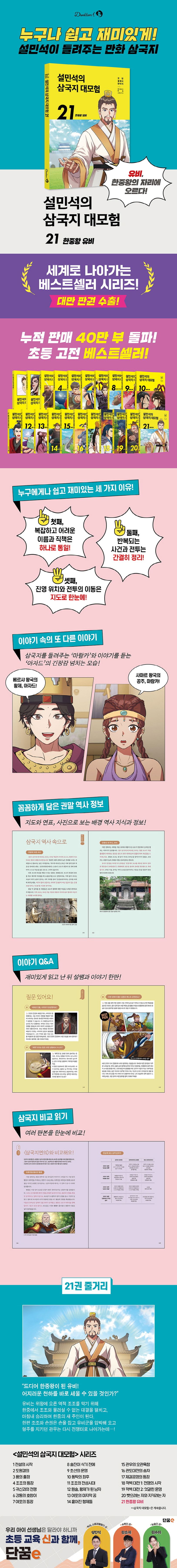 대만 판권 수출! 세계로 나아가는 베스트셀러 시리즈!삼국지는 약 1,800년 전 중국 삼국 시대의 역사를 바탕으로 창작된 이야기입니다. 혼란한 세상 속에서 꿈을 펼치며 나아간 영웅들의 용기와 지혜가 담겨 있어 오랜 시간 동안 사랑받고 있지요. 〈설민석의 삼국지 대모험〉은 그런 삼국지를 처음 접하는 어린이들도 재미있게 읽을 수 있도록 새롭게 엮은 책입니다.