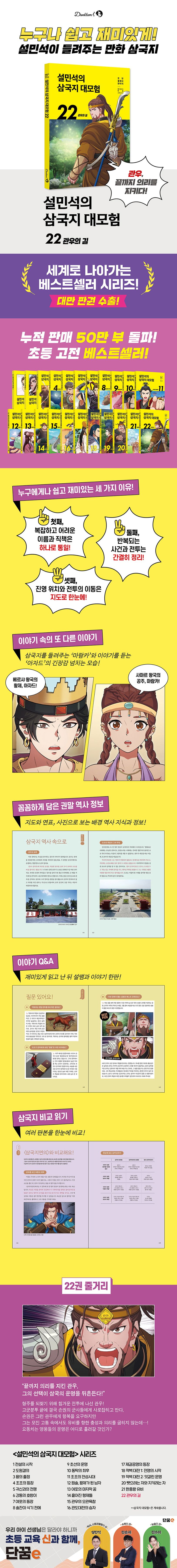 대만 판권 수출! 세계로 나아가는 베스트셀러 시리즈!삼국지는 약 1,800년 전 중국 삼국 시대의 역사를 바탕으로 창작된 이야기입니다. 혼란한 세상 속에서 꿈을 펼치며 나아간 영웅들의 용기와 지혜가 담겨 있어 오랜 시간 동안 사랑받고 있지요. 〈설민석의 삼국지 대모험〉은 그런 삼국지를 처음 접하는 어린이들도 재미있게 읽을 수 있도록 새롭게 엮은 책입니다.