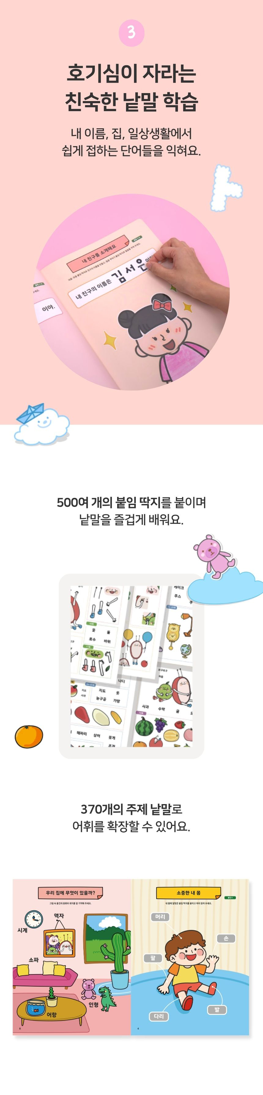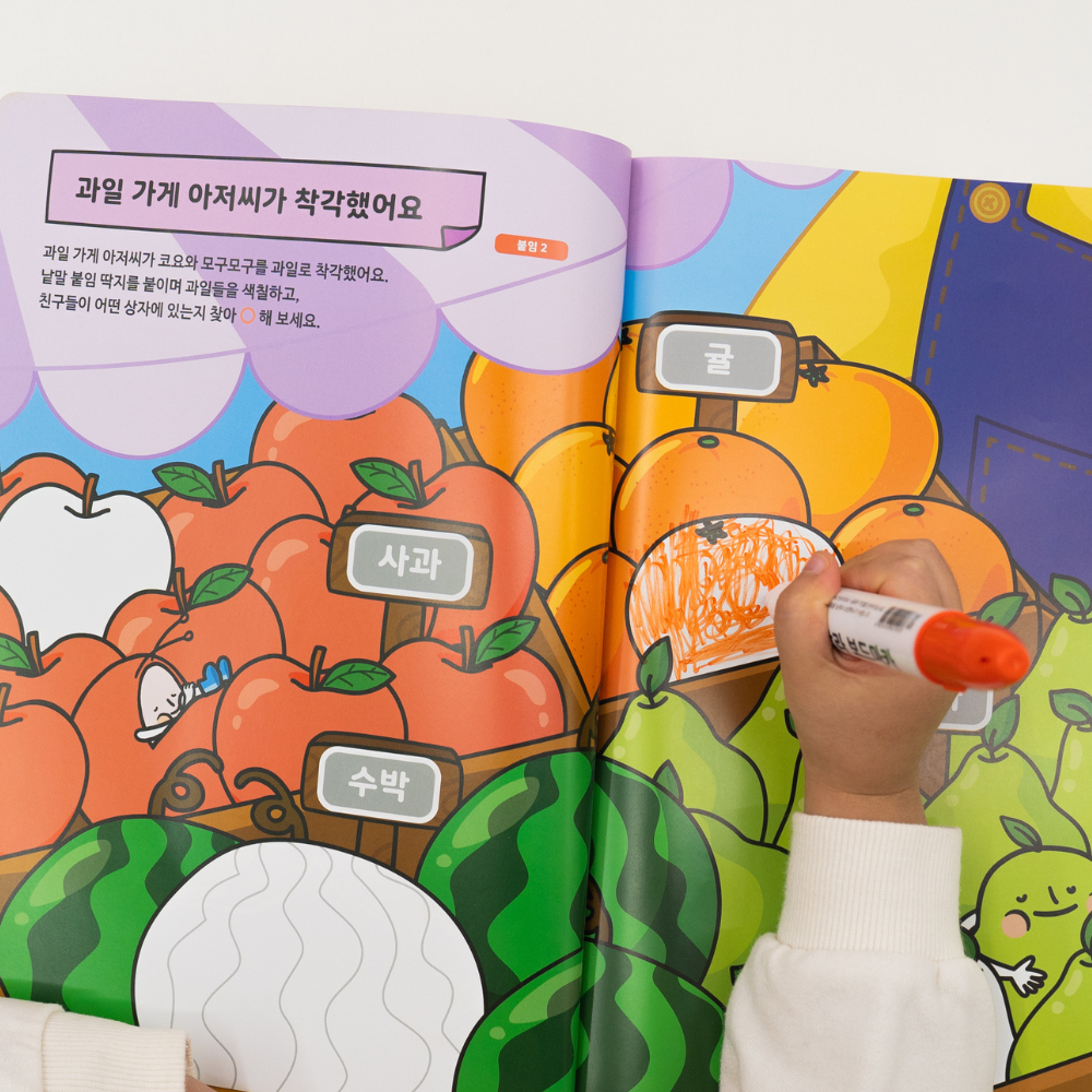 붙임딱지, 색칠하기, 오리기 등 놀이 기반 활동으로 구성된 이 책은 370여 개의 낱말을 자연스럽게 노출시키며 기초 문해력의 6대 요소를 다져줍니다. 앉아서 쓰게 하기보다, 움직이고 놀며 한글을 받아들이게 하고 싶은 부모님께 특히 추천드립니다.