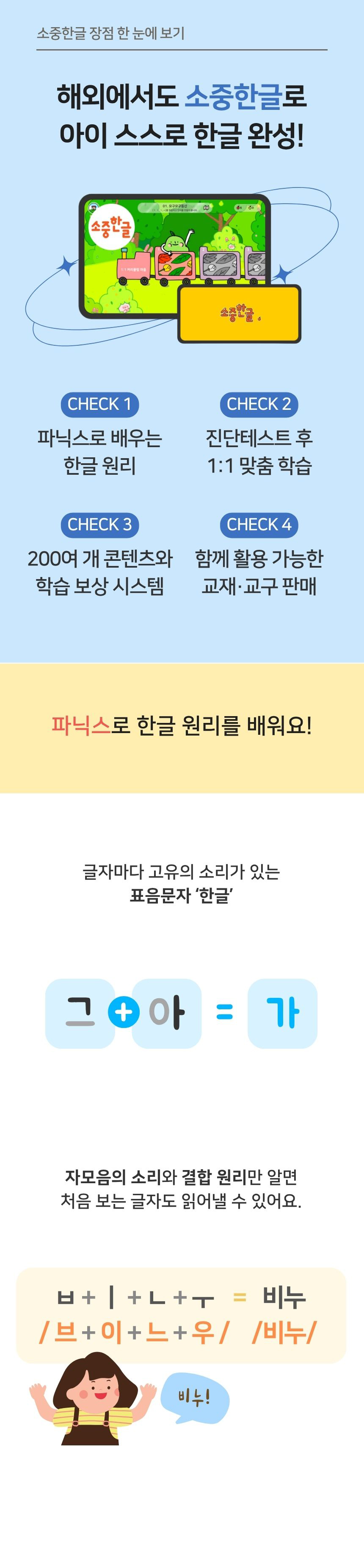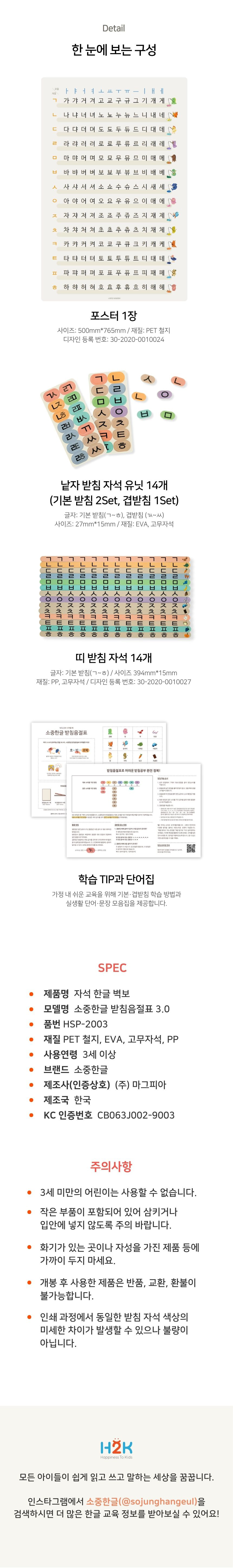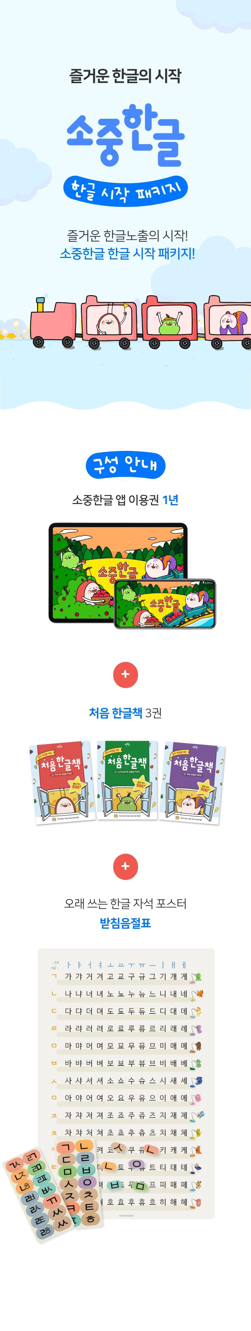 - 구성: 소중한글 앱 1년 이용권 + 처음한글책 3권 + 받침음절표