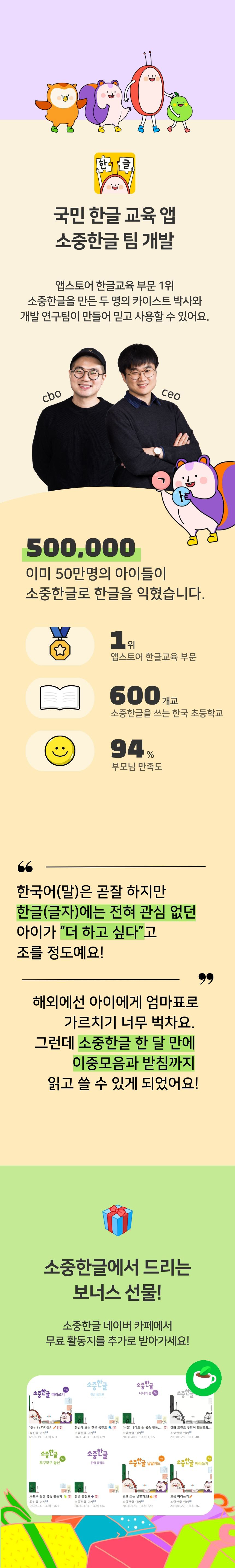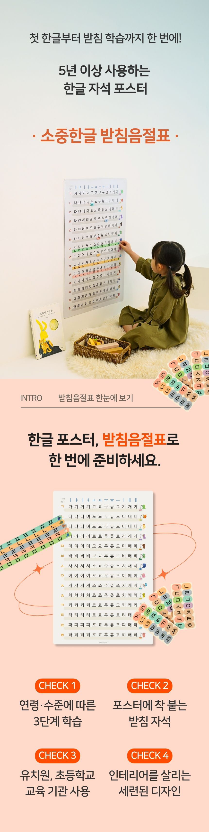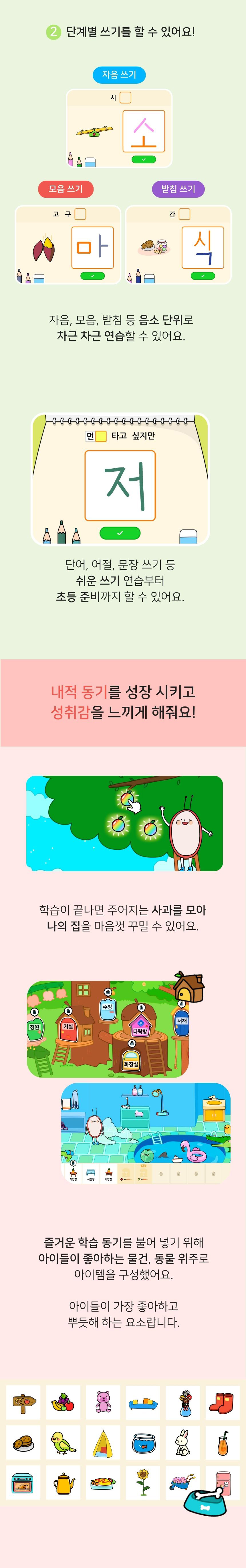 - 구성: 소중한글 앱 1년 이용권 + 처음한글책 3권 + 받침음절표