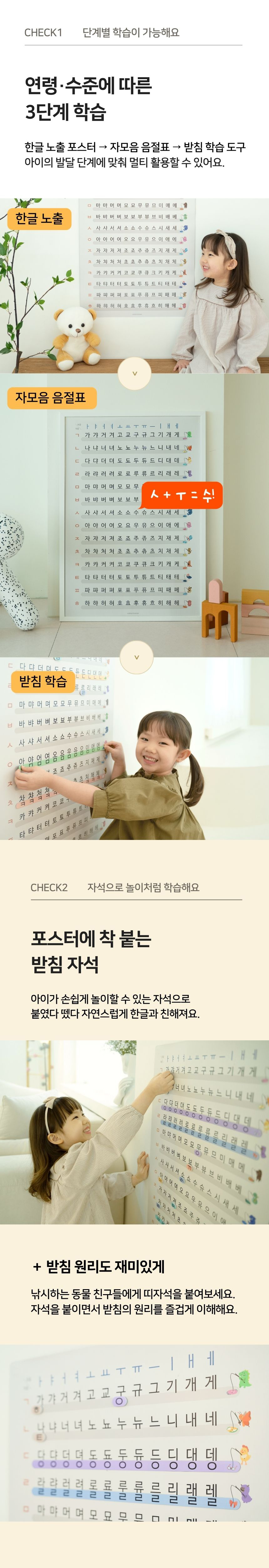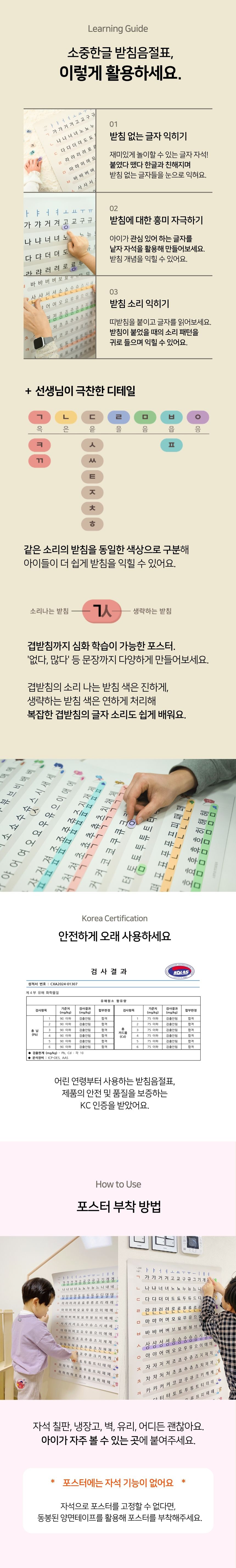 받침이 있는 글자와 없는 글자를 비교하며, 자석을 붙였다 떼며 배우는 받침 구조 학습 포스터.