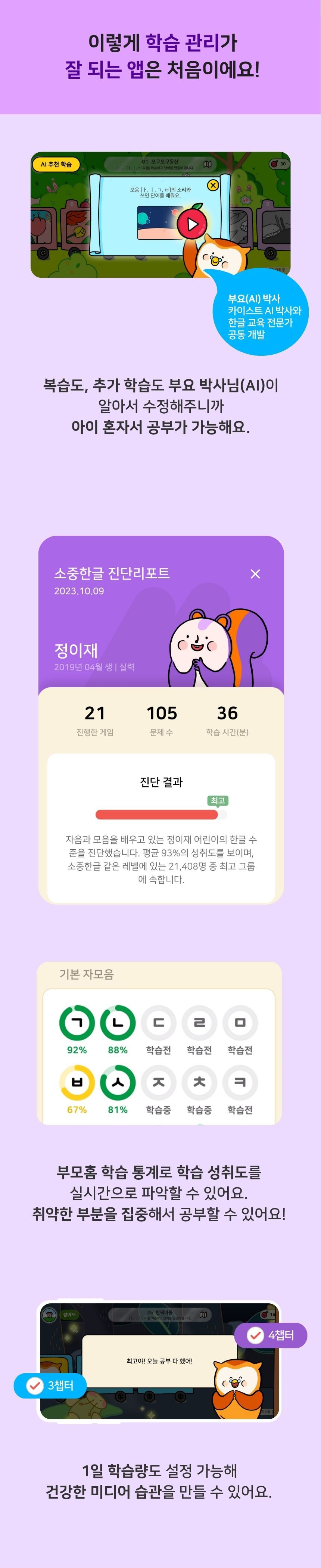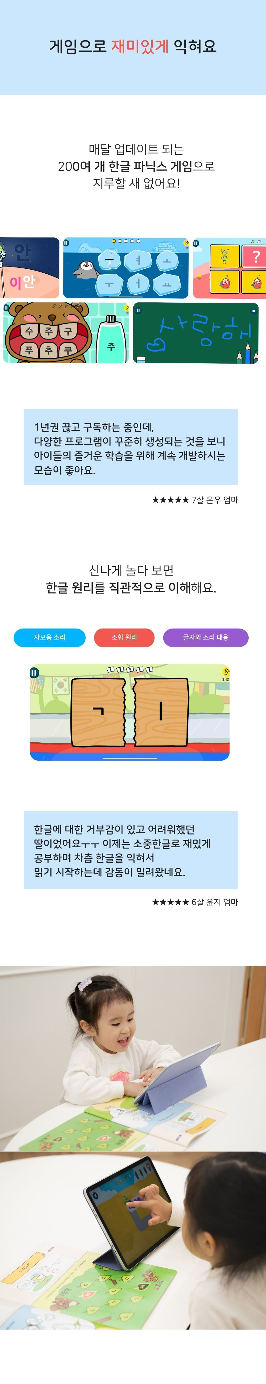 AI가 아이의 현재 수준을 분석하고, 200개 이상의 게임 기반 활동을 통해 파닉스부터 받아쓰기까지 자기 주도 학습을 유도하는 국내 1위 한글 교육 앱입니다. 글자 구조의 원리를 놀이처럼 익히며, 앱이 아이의 한글 발달 흐름을 이끌어 줍니다.