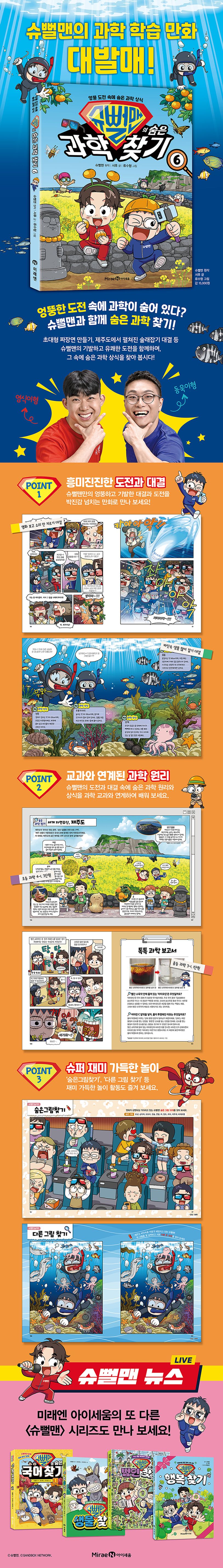 초대형 짜장면 만들기, 영화 보며 소리 안 지르기 대결, 제주도로 떠난 슈뻘맨 등 슈뻘맨만의 엉뚱하고 기발한 영상 콘텐츠를 흥미진진한 만화로 풀어 냈습니다. 물에 젖지 않는 휴지 영상, 빨간 소독약을 탄 물에 비타민 C를 넣었더니 물이 투명해지는 영상 같이 인터넷에 떠도는 신기한 영상 속 내용이 사실인지 거짓인지 슈뻘맨이 직접 파헤쳐 보는 ‘톡톡재판소’ 코너까지 수록하였지요. 슈퍼 웃음을 주는 슈뻘맨 에피소드를 지금 바로 만나 보세요.숨은 과학 상식을 찾아 보는 정보 페이지!