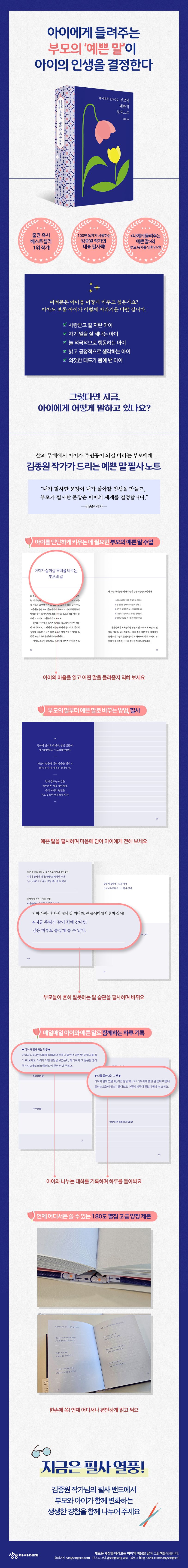《아이에게 들려주는 부모의 예쁜 말 필사 노트》를 읽고, 지금 아이에게 어떻게 말하고 있는지 돌아보자. 실제 생활에서 부모들이 흔히 잘못하는 말 습관을 바꾸고, 아이에게 필요한 예쁜 말을 낭독하며 필사하는 지면이 다양하게 구성되어 있다. 필사하며 마음에 담았던 예쁜 말을 아이에게 건네 보고, 아이의 반응은 어땠는지, 오늘과 내일을 기록하며 하루를 마무리하는 하루가 계속된다면 아이가 살아갈 세계도 바뀔 것이다.