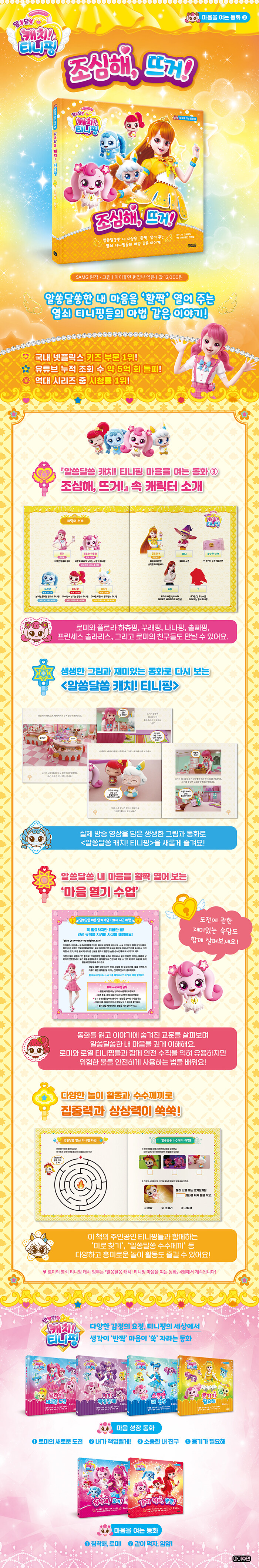아이휴먼이 펴내는 『알쏭달쏭 캐치! 티니핑 마음을 여는 동화』 시리즈는 이런 〈알쏭달쏭 캐치! 티니핑〉의 에피소드를 동화로 재구성한 책입니다. 재미있는 이야기로 어린이들의 마음을 사로잡은 것은 물론, 어린이들이 여러 상황에서 느낄 수 있는 다양한 감정을 깊이 이해하며 바른 마음을 기를 수 있도록 인성 요소까지 담았습니다. 이번 『알쏭달쏭 캐치! 티니핑 마음을 여는 동화 ③ 조심해, 뜨거!』는 애니메이션의 4화를 엮은 그림책으로, 실제 방송 화면을 그대로 담은 생생한 그림이 아이들의 흥미와 상상력을 자극합니다. 이야기를 모두 읽은 뒤에는 ‘알쏭달쏭 마음 열기 수업’에서 화재 사고 예방에 대해 배울 수 있습니다. 또한 주인공 티니핑들과 함께하는 ‘미로 찾기’ 놀이 활동으로 손가락 힘과 문제 해결력을 기르고, ‘알쏭달쏭 수수께끼 타임’으로 이야기를 돌아보며 마지막까지 재미있게 책을 즐길 수 있습니다. 아이들에게 TV 애니메이션의 감동을 생생하게 느끼며 내 마음을 깊게 이해하고 성장하는 기쁨을 선물해 주세요!