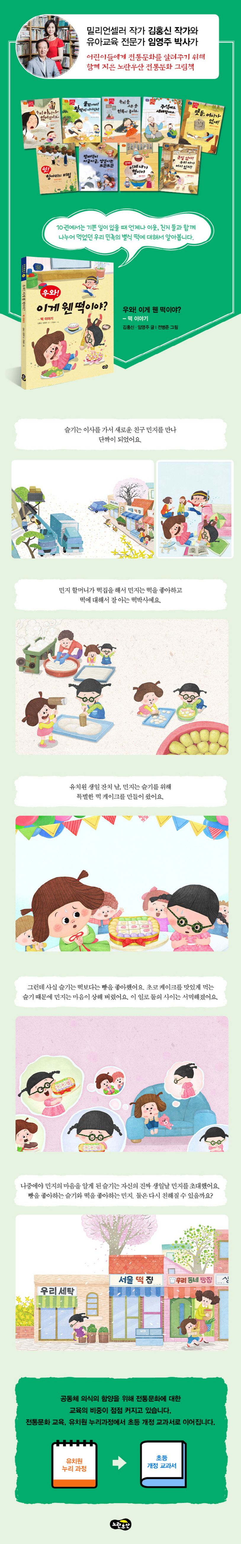 전통문화는 누리과정의 사회관계 영역인 우리나라의 전통, 우리나라의 문화에서 배워야 하는 항목입니다. 누리과정에서 이어지는 초등 1-2학년군 개정 교과서에서도 전통문화에 대한 교육의 비중이 높아졌습니다. 그것은 점점 중요하게 인식되고 있는 공동체 의식의 함양을 위해서입니다. 유치원 시기에 배우고 익혀야 하는 것들 중 전통문화에 대한 중요성이 커진 것입니다. 그림책을 통해 재미있게 저절로 알아가도록 해 주세요.