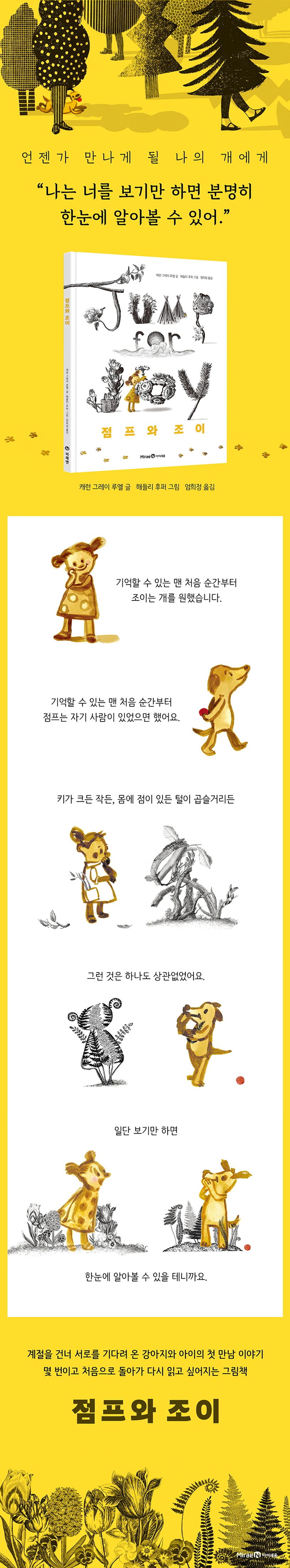 점프와 조이가 각자의 자리에서 몇 번의 계절을 건너는 동안 똑같이 변하지 않았던 생각은 ‘나는 너를 한눈에 알아볼 수 있다’였다. 이 세상에 아무리 많은 강아지와 아무리 많은 사람이 있어도 누가 내 개일지, 또 누가 내 사람일지 알아볼 거라는 확신. 이것은 사실 반려동물을 입양하고 키우는 수많은 사람들이 만국 공통으로 느끼는 강렬한 경험이기도 하다. 첫눈에 알아봤다는 사람들, 이런저런 이유로 돌아서야 했다가 끝끝내 생각을 거둘 수 없어 다시 찾아 가족이 된 경우도 드물지 않다. 우리와 반려동물의 관계가 그러하듯, 내거는 조건도 바라는 대가도 없이 서로를 만난 것이 그저 기뻐서 뛰고 또 뛰는 점프와 조이의 경쾌한 몸짓은 보는 것만으로도 즐겁다. 나만의 반려동물을 기다리고 있거나 이미 만난 행운의 반려인이 아니더라도 순도 높은 관계가 주는 단순한 기쁨과 그 귀함을 아는 이라면 누구나 《점프와 조이》에게 자신의 곁을 오래오래 내어 주고 싶어질 것이다.