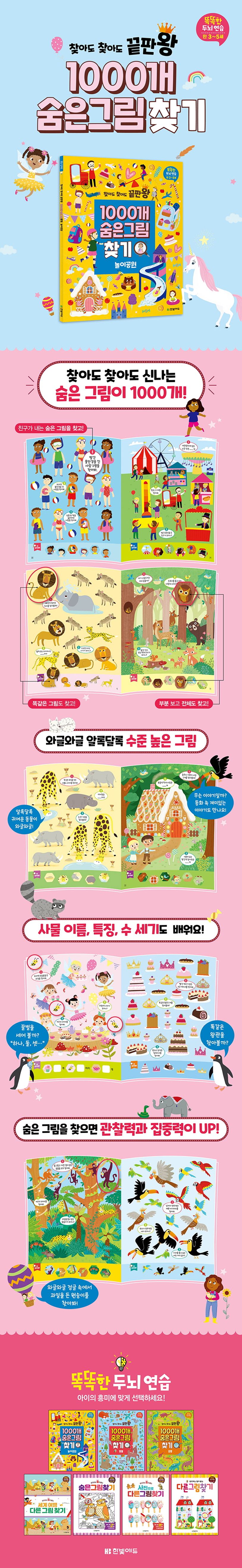 숨은그림찾기는 관찰력, 집중력, 판단력, 인지력, 문제해결력 등 두뇌의 고른 발달에 도움이 되는 활동입니다. 아이가 〈찾아도 찾아도 끝판왕 1000개 숨은그림찾기〉 시리즈를 즐기며 관찰력과 집중력을 쑥쑥 키울 수 있게 도와주세요.