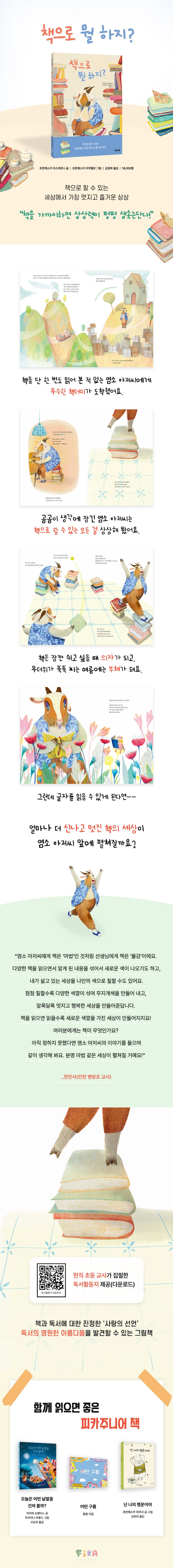 염소 아저씨는 책으로 할 수 있는 모든 상상력을 동원했어요. 페이지가 많고 표지가 딱딱한 책을 모아 놓으니 편안한 의자가 되었어요. 넓적한 판형에 페이지가 얇은 책으로 발돋움을 만들면 높은 선반에 있는 물건도 쉽게 꺼낼 수 있었지요. 가끔 만나고 싶지 않은 누군가가 집에 찾아올 때는 책으로 알록달록한 벽을 만들어 몸을 숨길 수 있는 비밀 장소가 되기도 했어요. 이뿐이게요? 무더위가 푹푹 찌는 여름에는 판형이 가늘고 페이지가 얇은 책 하나를 꺼내 부채처럼 흔들면 선풍기 바람 못지않게 아주 시원했답니다. 해먹에서 느긋하게 낮잠을 잘 때는 가로가 긴 책으로 눈 그늘을 만들어 햇빛을 피했지요. 찬 바람이 쌩쌩 부는 겨울에는 손바닥만 한 작은 책을 모아 창가에 척척 쌓아 두었어요. 강한 추위가 몰려와도 끄떡없답니다.
