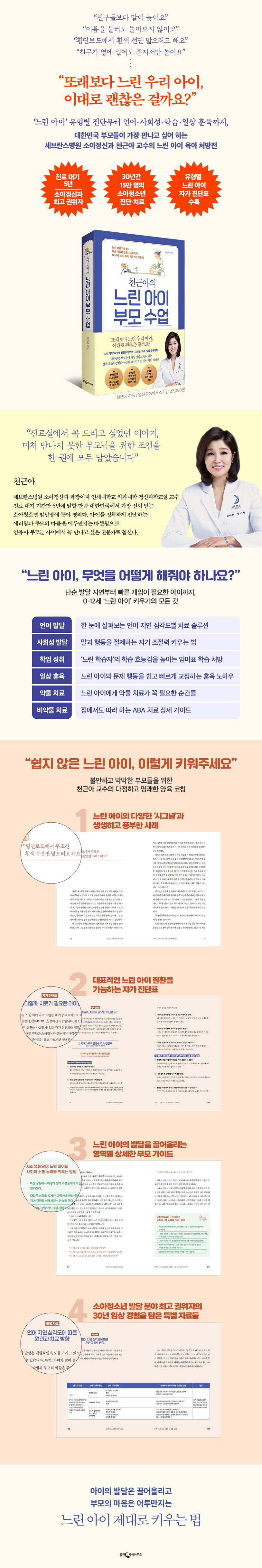 ‘느린 아이’를 키우는 부모들이 가장 먼저 알고 싶은 것은 “우리 아이가 정말로 느린 아이일까? 어느 정도 심각한 걸까?”라는 의문에 대한 답이다. 이 책은 자신의 이름이 불렸을 때 아이의 반응을 나타내는 ‘호명 반응’, 과거에 들었던 말을 상관없는 상황에서 꺼내는 ‘지연 반향어’, 발끝을 들고 걷는 ‘까치발’ 등 부모들이 대표적으로 의심하는 생생하고 풍부한 사례를 바탕으로, ‘느린 아이’가 보내는 여러 시그널을 통해 부모들이 자녀의 상태를 보다 세심하게 파악할 수 있도록 했다.