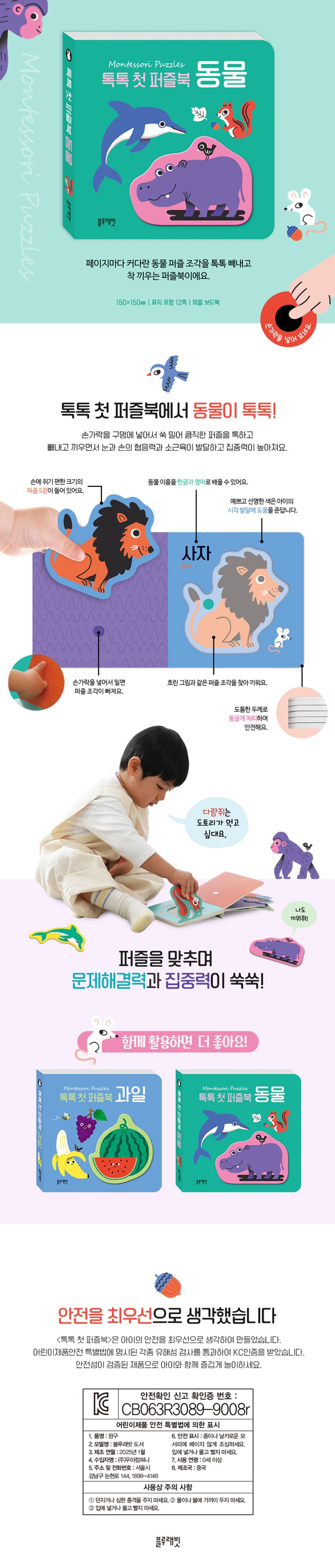 〈톡톡 첫 퍼즐북〉은 아이의 안전을 최우선으로 생각하여 만들었습니다. 어린이제품안전 특별법에 명시된 각종 유해성 검사를 통과하여 KC인증을 받았습니다.