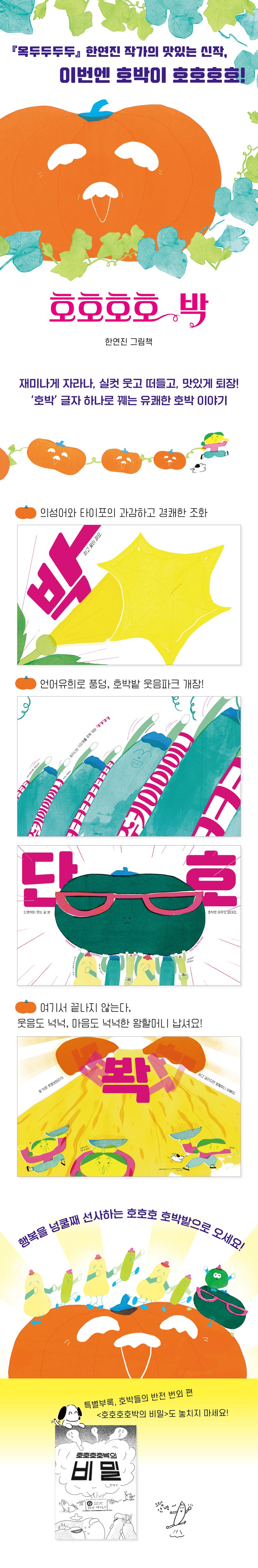 『호호호호박』은 크게 세 가지 이야기로 전개됩니다. 처음에는 ‘호오 호오’ 따뜻한 바람이 불 때 자라나 ‘박!’ 하고 꽃이 피기까지, 호박의 생태로 이야기를 엽니다. 빽빽한 호박밭에서 ‘호박 커튼’을 ‘호옥’ 들추면 호박들의 무대가 펼쳐집니다. 애호박은 ‘애호 애호’, 주키니는 ‘키키키키’, 저마다 이름의 음절을 딴 웃음을 터뜨립니다. 온갖 호박들의 웃음 무대가 막을 내리면, 커다란 웃음보따리가 된 호박으로 왕할머니가 커다란 호박죽을 만듭니다. 이렇게 이야기가 쌓일수록 웃음이 무르익어 ‘호호호호박’이 됩니다. 호박이 웃음을 물들이는 걸까요?