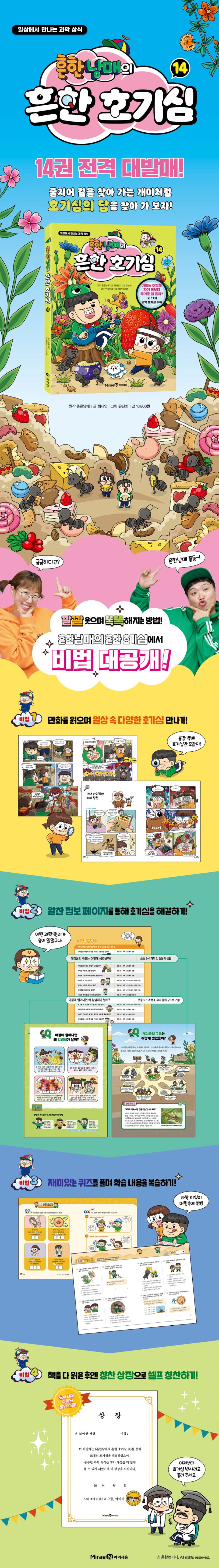 호기심을 해결하다 보면, 과학 지식이 쑥쑥 자라나요! 《흔한남매의 흔한 호기심》 14권에서는 ‘개미는 어떻게 자기 몸보다 무거운 걸 들까?’, ‘바퀴벌레는 어떤 특징을 가지고 있을까?’ 등 곤충에 대한 호기심부터, ‘아침에 일어나면 왜 입냄새가 날까?’, ‘배고플 때 꼬르륵 소리는 왜 나는 걸까’ 등 일상에서 한 번쯤은 궁금증을 느껴 봤을 18개의 호기심을 모았습니다.초등 과학 교과 완벽 연계!