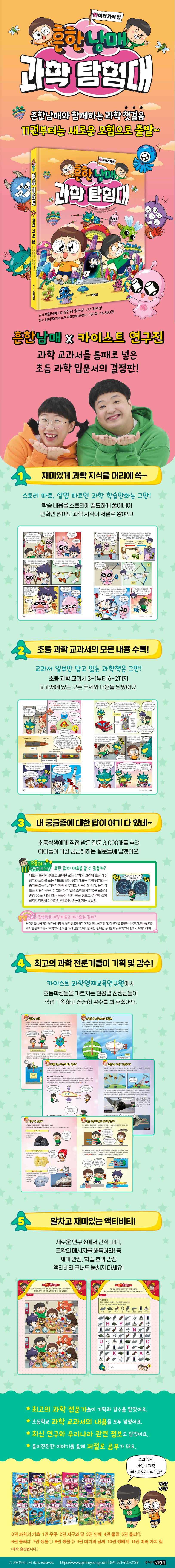스토리 따로, 학습 내용 따로인 과학 학습만화는 이제 그만! 그동안 과학 학습만화는 스토리와 학습 내용이 물과 기름처럼 섞여 아이들이 만화 스토리만 읽고 넘어가는 경우가 많았습니다. 《흔한남매 과학 탐험대》는 학습 정보를 스토리에 절묘하게 녹여 내어, 만화만 봐도 학습 내용이 저절로 기억날 수 있도록 구성하였습니다. 이제 즐겁게 만화를 읽으며 나도 모르게 과학 지식을 차곡차곡 쌓아 가세요!