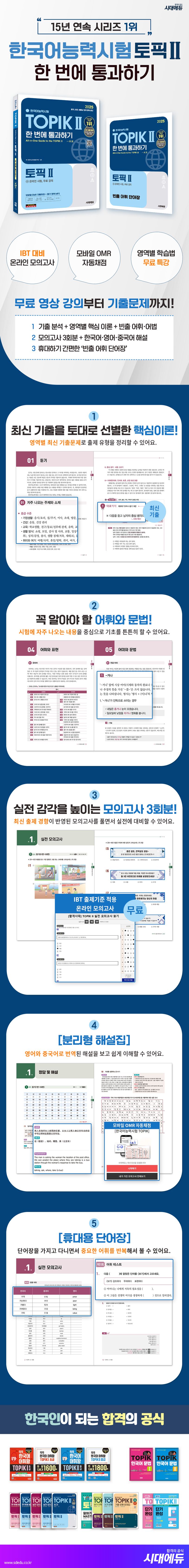 이 책은 한국어를 배우는 외국인 수험생들이 효과적으로 한국어 공부를 하고 TOPIK에 대비할 수 있도록 만들어졌습니다. 기출문제를 꼼꼼히 분석하고 유형화한 핵심 이론부터 실전 감각을 익힐 수 있는 모의고사와 독학이 가능한 다국어 해설. 휴대할 수 있는 소책자 어휘집과 다운로드 없이 바로 들을 수 있는 QR코드 듣기 파일까지. 긴 시간 동안 한국어교재를 연구하고 개발해 온 한국어능력시험연구회가 한국어교육 전문가 임준 선생님과 함께 시험에 필요한 모든 것을 단 한 권으로 압축하였습니다. 한국과 한국어를 사랑하는 당신, 〈한국어능력시험 TOPIK II 한 번에 통과하기〉와 함께 합격의 꽃길만 걸으시길 바랍니다.