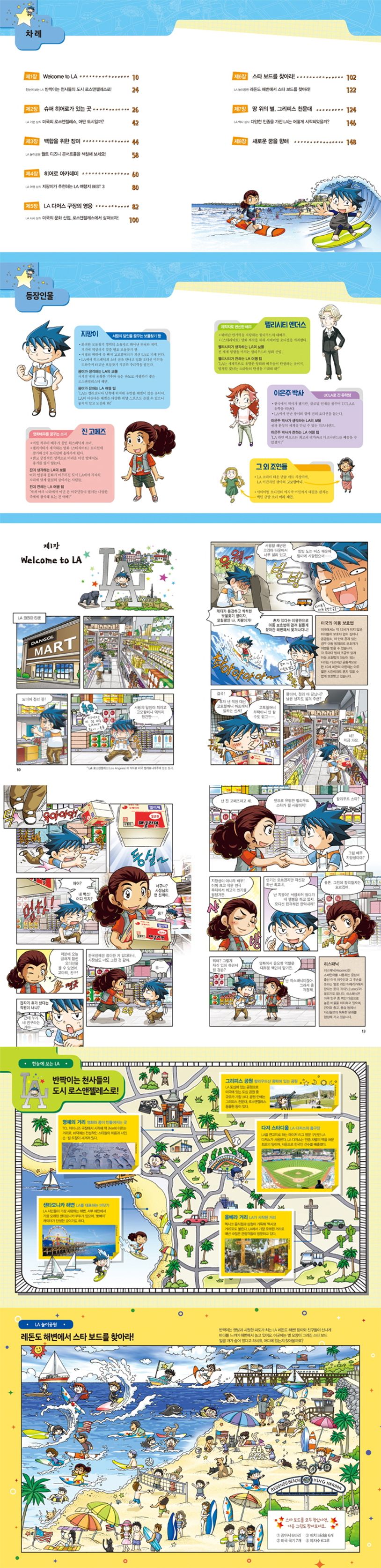 [세계 도시 탐험 만화 역사상식] 시리즈는 각 화의 뒷부분마다 스토리와 연관이 있는 정보를 삽입하여 정보의 지속력까지 높였습니다. [LA에서 보물찾기]에는 지도를 바탕으로 사진과 글을 삽입하여 로스앤젤레스의 중요한 곳들을 알려 주는 한눈에 보는 LA, 로스앤젤레스의 위치와 산업, 기후, 인구, 문화 등을 수록한 LA 기본 상식을 담았습니다. 또한 로스앤젤레스의 역사와 자연이 담긴 여행지 세 곳을 선정해 생생한 후기를 들려주는 LA 여행 상식, 미국의 문화 산업을 담은 LA 시사 상식과 이민자들이 정착해 만들어진 도시인 LA의 역사 상식까지 확인할 수 있습니다. 여기에 월트 디즈니 콘서트홀 컬러링, LA 해변의 숨은 그림 찾기로 도시를 탐험해 볼 수 있는 LA 놀이공원을 더하여 재미를 높였습니다.