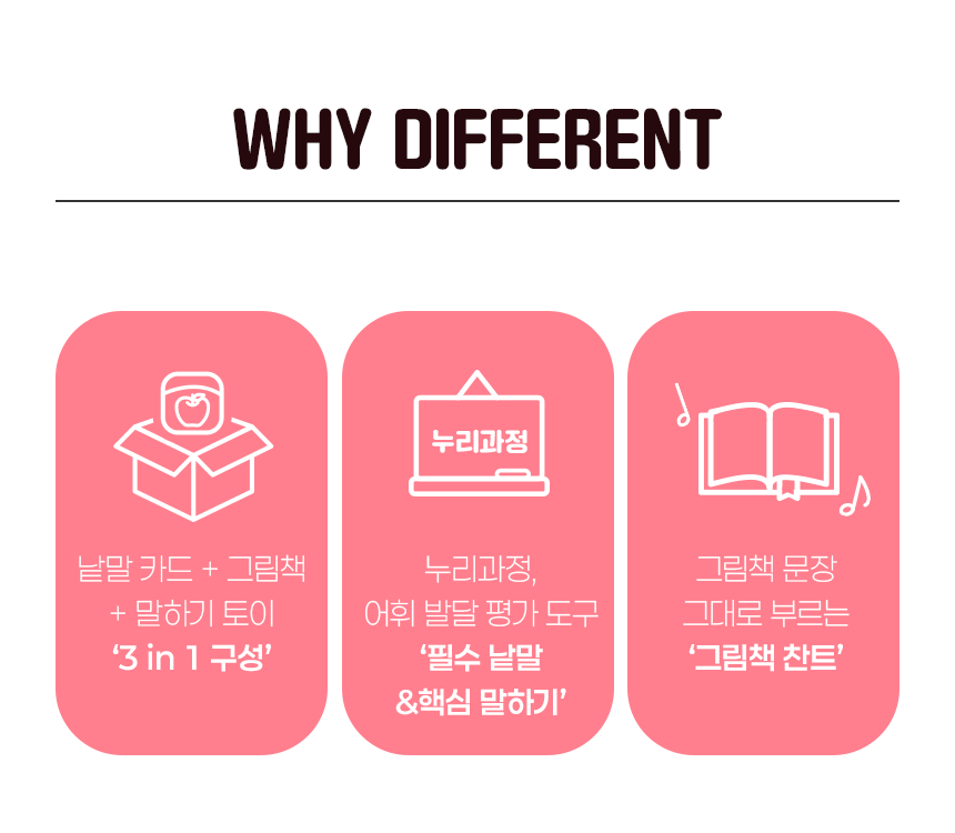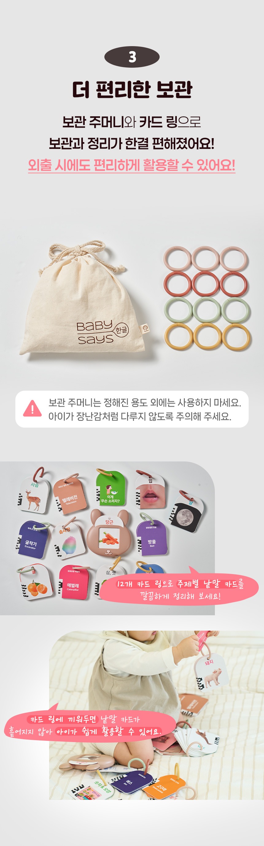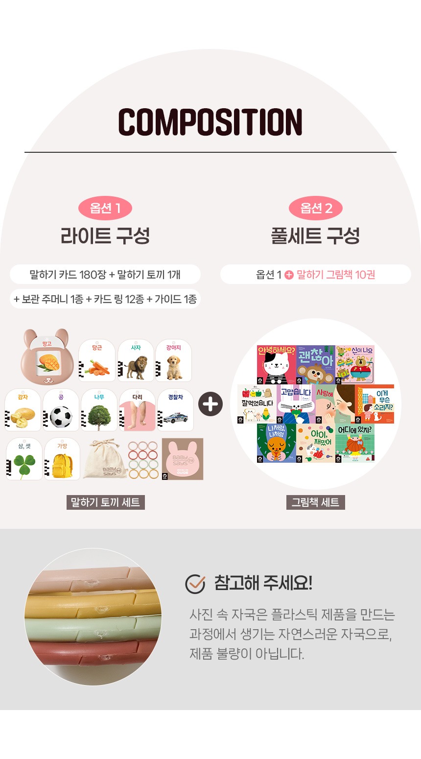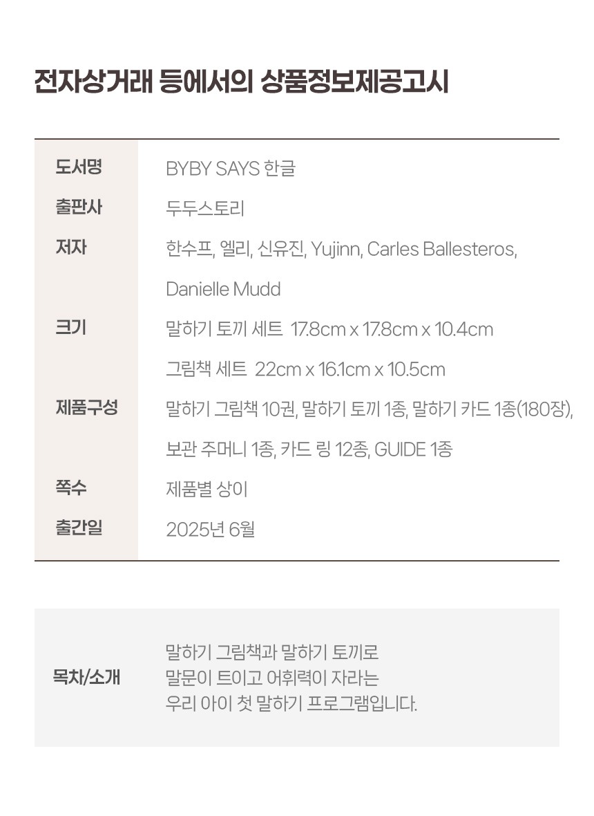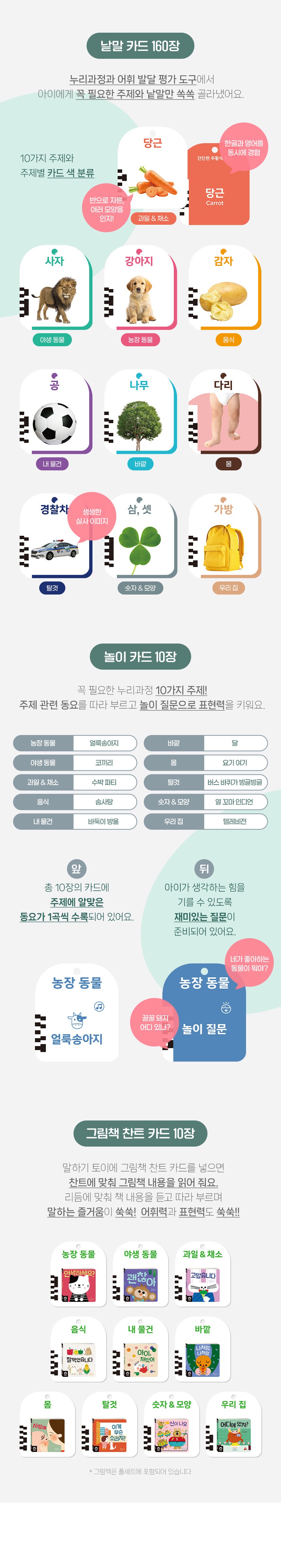 - 구성: 말하기 카드 180장+말하기 토끼 1개+보관 주머니 1종+카드 링 12종 +가이드 1종+말하기 그림책 10권