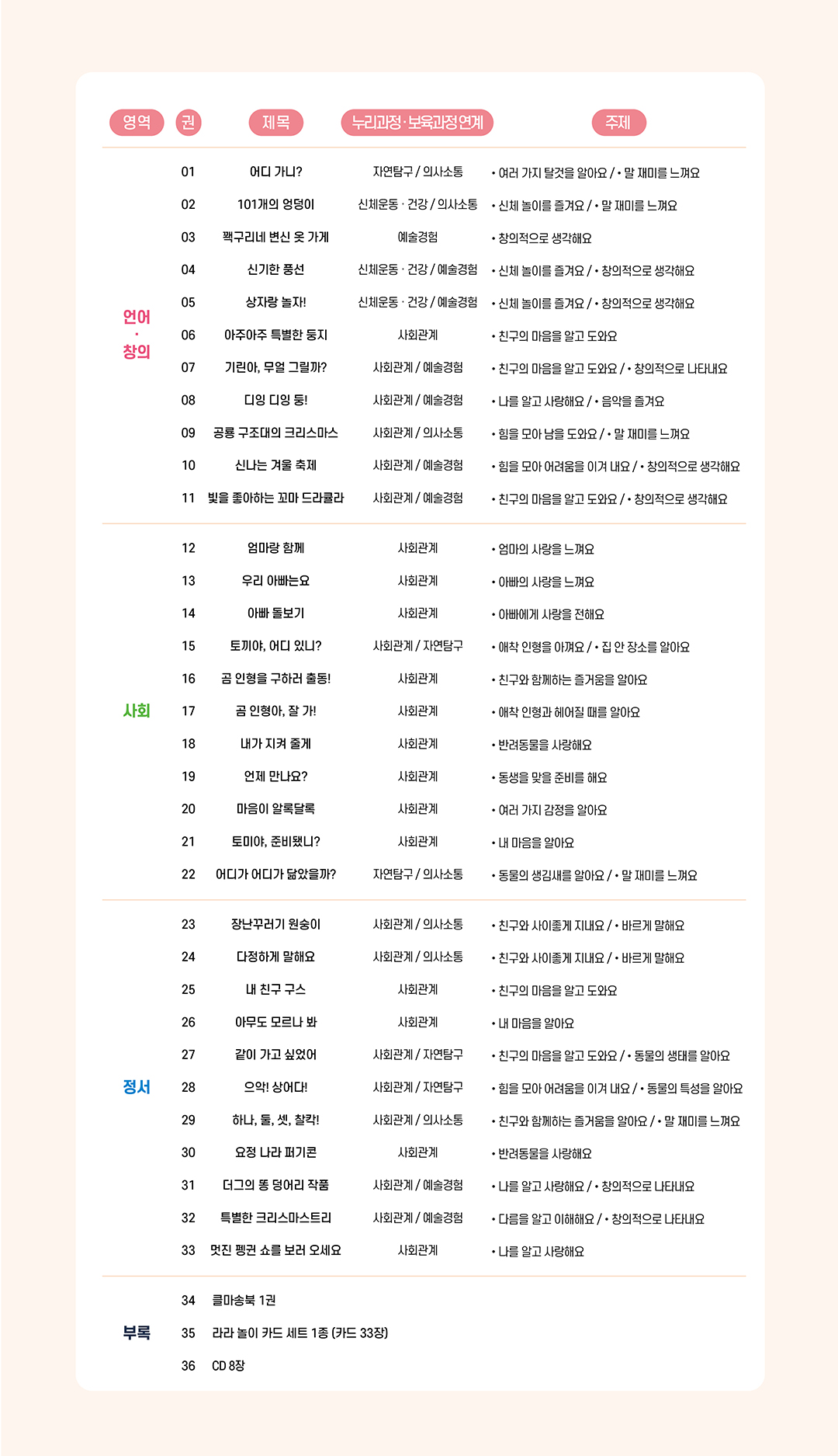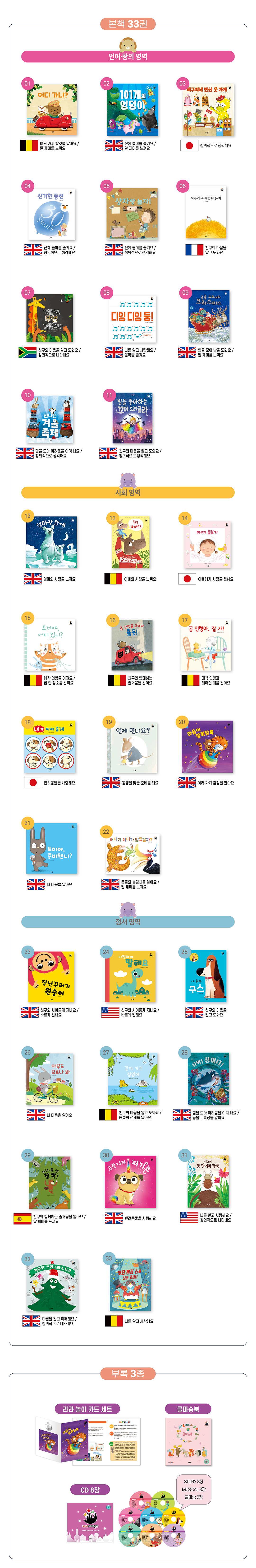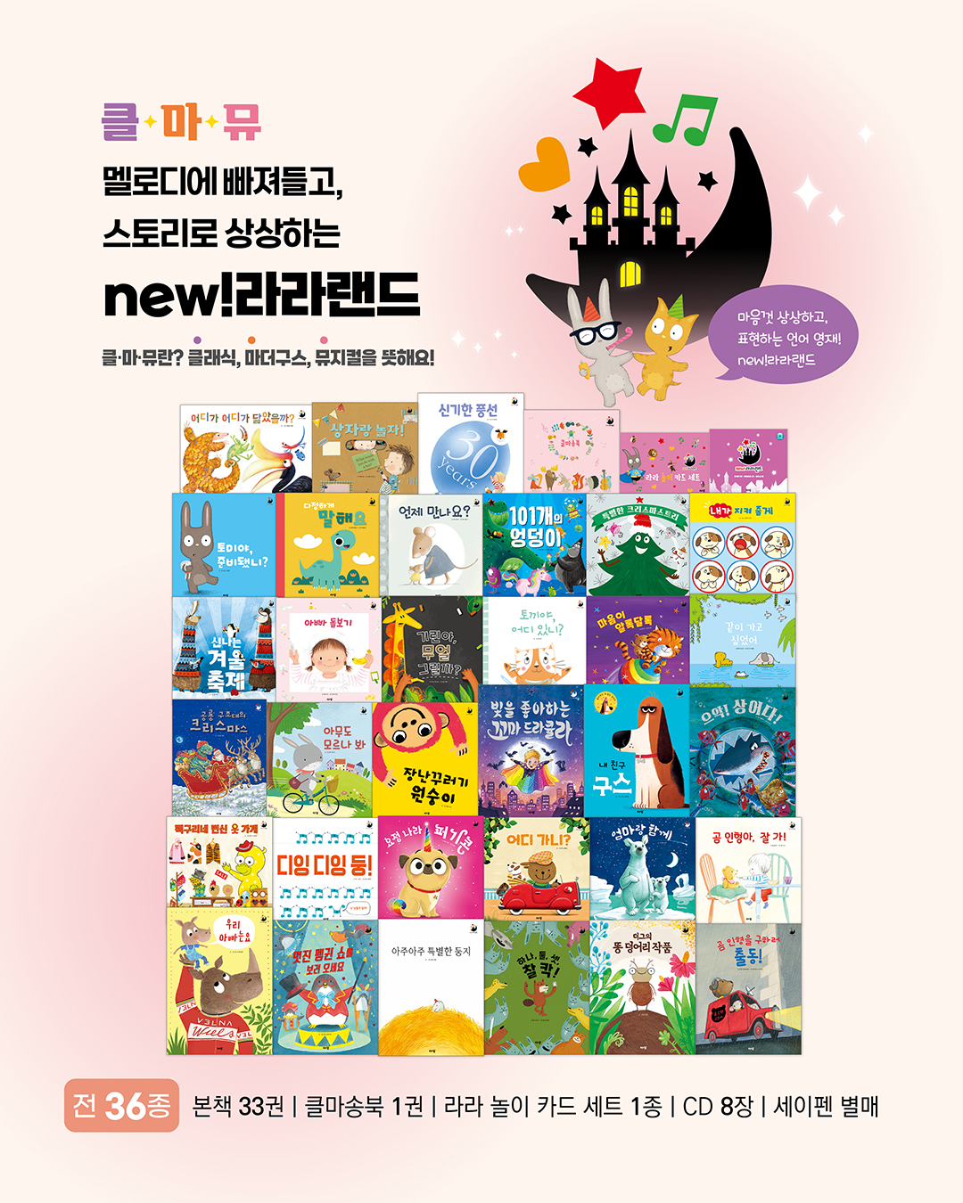 - 구성: 전 36종(본책 33권, 클마송북 1권, 라라 놀이 카드 세트 1종, CD 8장) *세이펜 별매